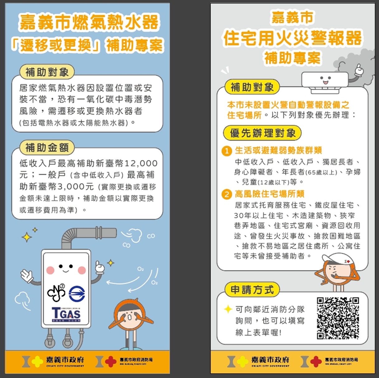 郭立昌說明,市府今年共推出4項消安補助政策,包含補助住宅用火災警報器(住警器)、瓦斯定時開關,以及氣熱水器更換或遷移補助相關補助措施包括:
