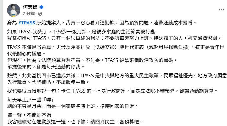 不過,何志偉直言:「卡住TPASS 的,不是行政體系,而是立法院不審預算,卻讓通勤族買單。」他呼籲,預算審議不該淪為政治對抗的工具,更不該拿民生政策當籌碼。
