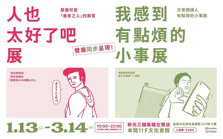 新光三越高雄左營店2026首波展覽,邀請在日本累積吸引超過 70 萬人次參觀的人氣情感主題展覽系列《人也太好了吧展》與《我感到有點煩的小事展》首登高雄!由東京策展團隊 entaku 打造的《人也太好了吧展》與《我感到有點煩的小事展》,以文字、插畫與照片記錄真實生活裡的小觀察,讓觀眾在展場中,看見那些平常被忽略的溫柔與情緒,重新感受日常的可愛。
