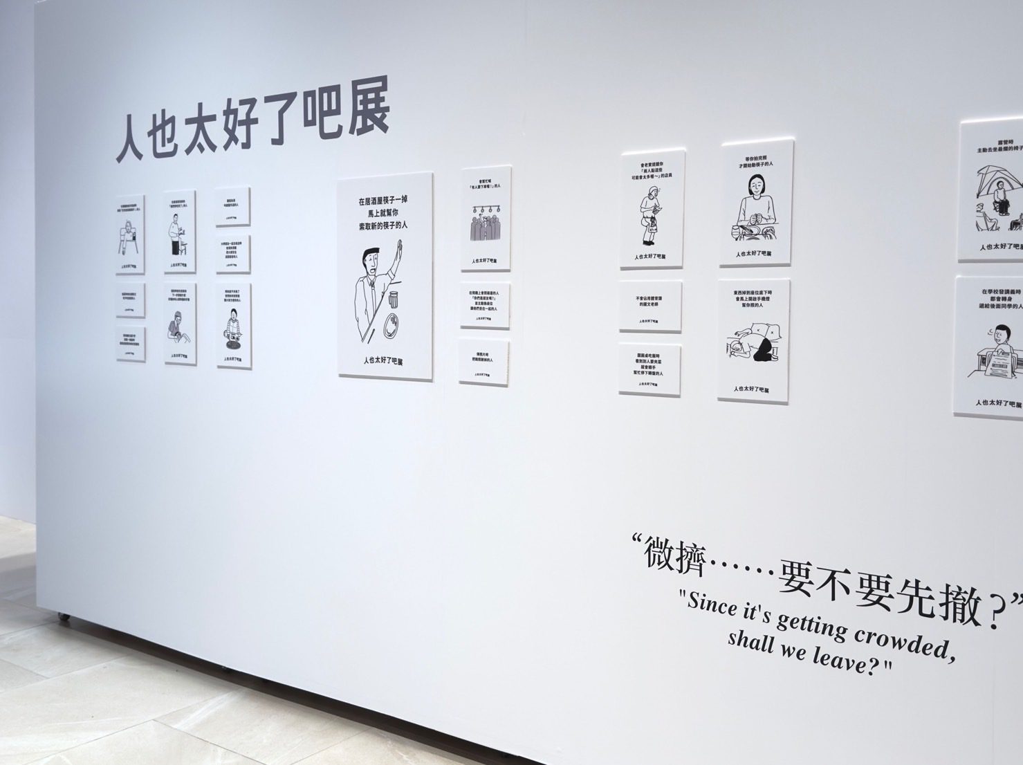 《人也太好了吧展》收藏了生活中的「超好人瞬間」。像是排隊時提醒你前面還有人的人;線上會議前貼心提醒你「麥克風沒開」的人;會把充電線推得超靠近再還你的人;看到外國人排隊錯方向,會上前幫忙指路的人。這些不起眼的小動作,卻讓人突然覺得:「啊~人真的好善良。」