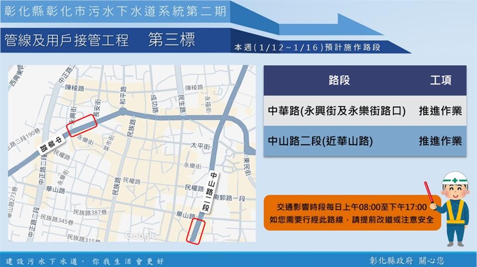 【彰化市污水下水道施工 公告1/12(一)~1/16(五)】
