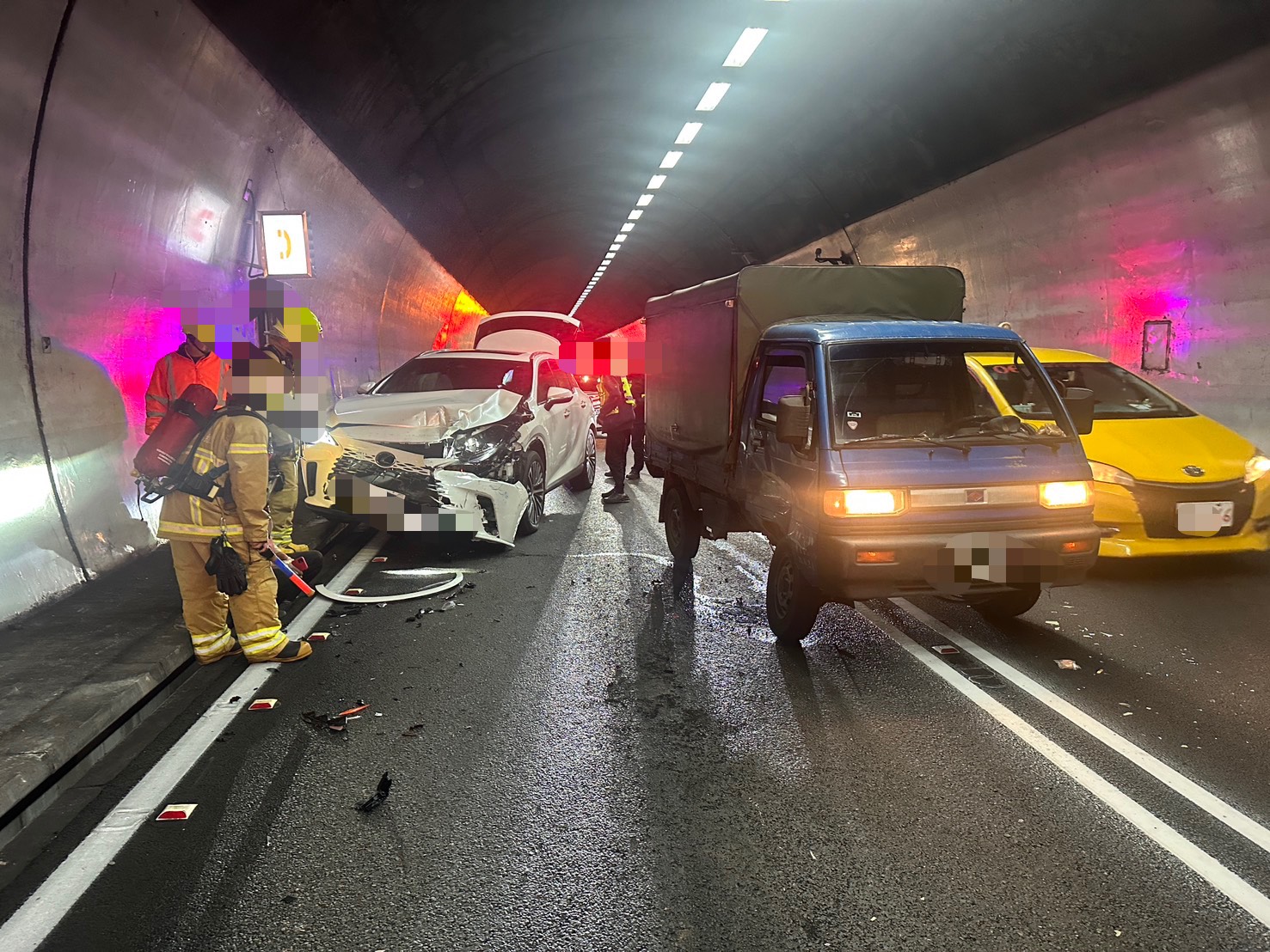 國5北向22.7公里處雪山隧道內,12日下午2時22分,1輛自小貨車未注意車前狀況而緊急煞車,致偏移至外側車道,遭行駛中的自小客車撞擊。