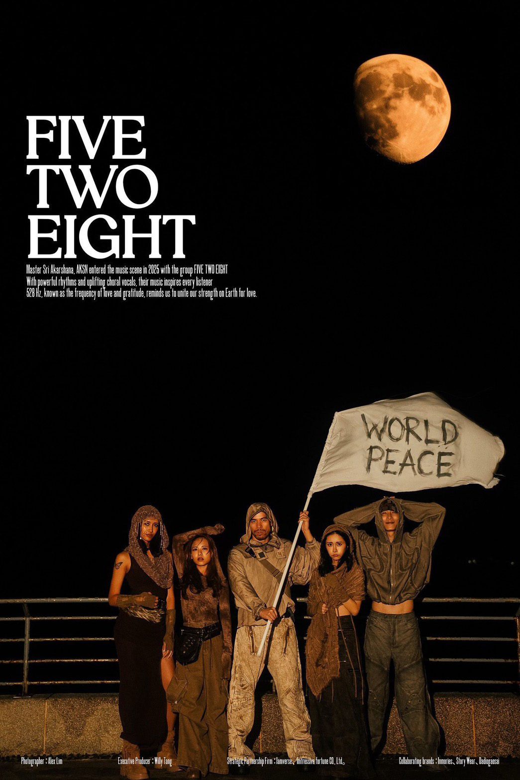 「FIVE TWO EIGHT 五二八」由被粉絲暱稱為「歌神」的 阿卡莎納 領軍,攜手團員 NIKA、劉玳妍、MIA、KAINA 組成。而最值得一提的是,NIKA即為當年紅極一時的「老鷹四少」之一的陳彥允,消息一出令人期待不已!阿卡莎納去年推出個人單曲〈Don’t give a 發〉後,於去年12月21日、80年一遇的天赦日正式成團,並推出「FIVE TWO EIGHT五二八」首發單曲 〈Fight for Love〉,以音樂作為傳遞愛、和平與療癒的媒介。