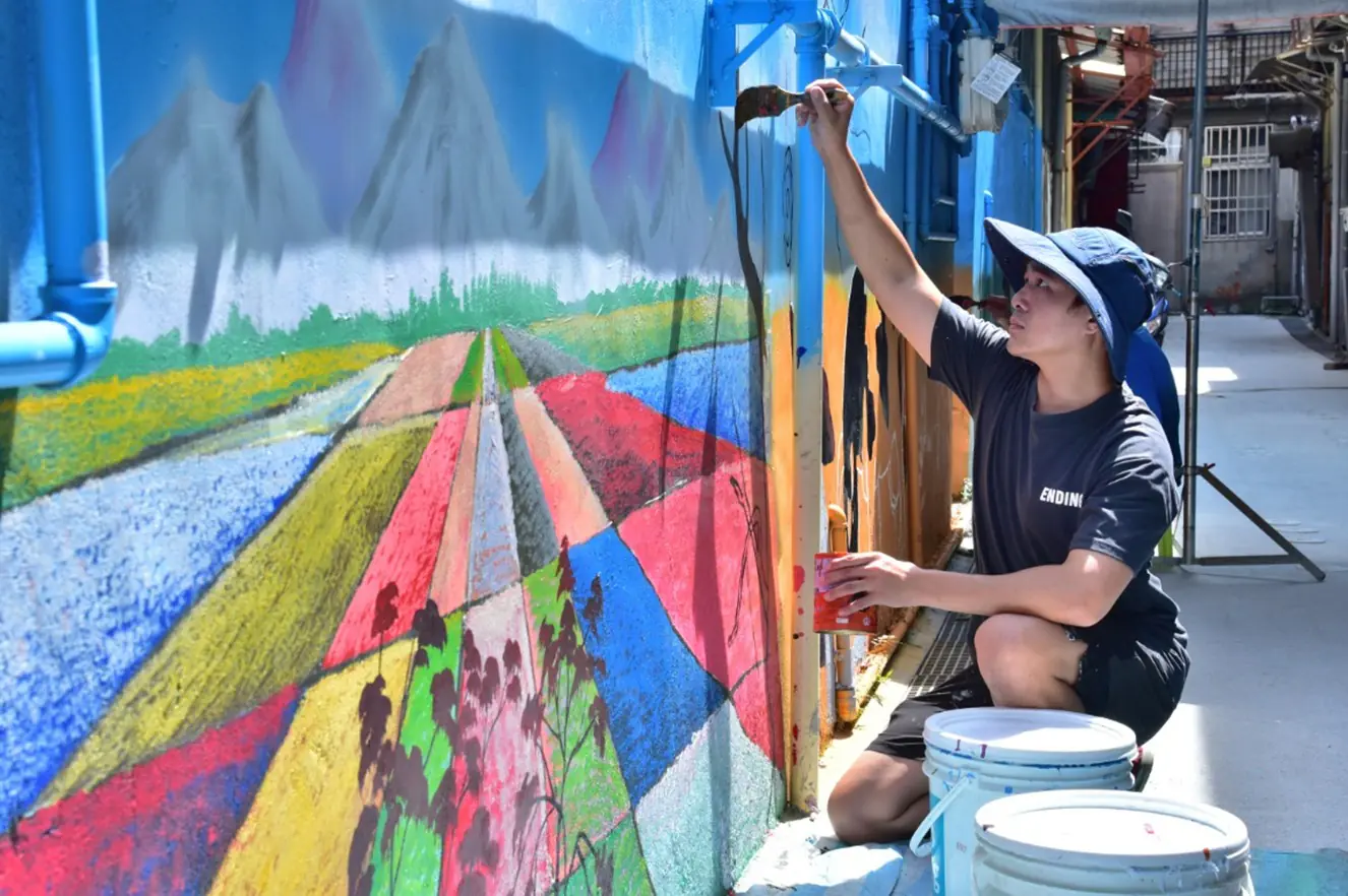 藝術家於後巷彩繪牆面中