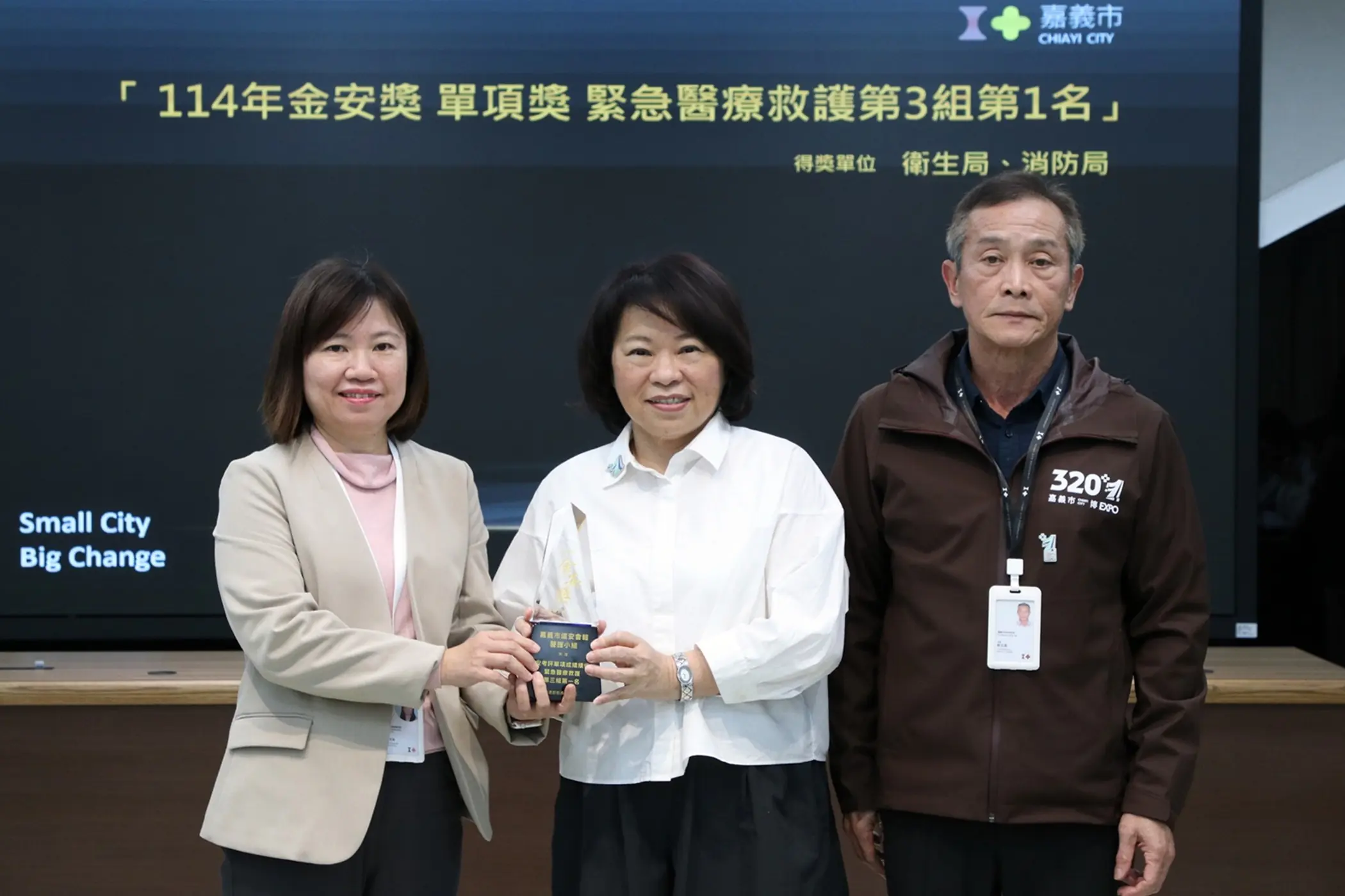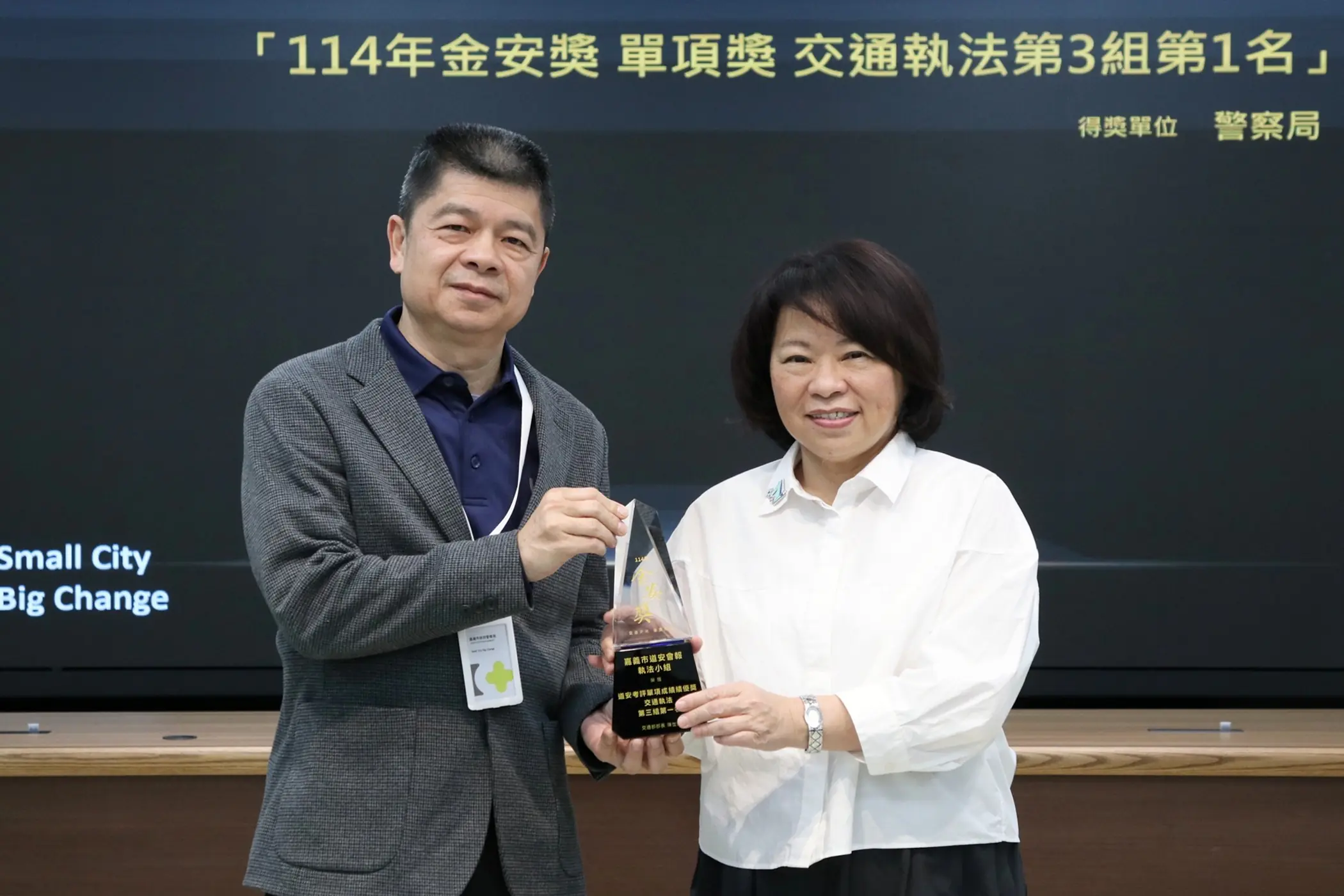嘉義市政府致力於改善交通安全,114年榮獲交通部「金安獎頒發交通工程組第三組第一名、交通執法組第三組第一名、緊急醫療救護第三組第一名,以及交通安全宣導組第三組第二名等佳績13日參與道安考評相關業務單位會議中將獎項轉呈市長黃敏惠,與市府團隊共享榮耀。