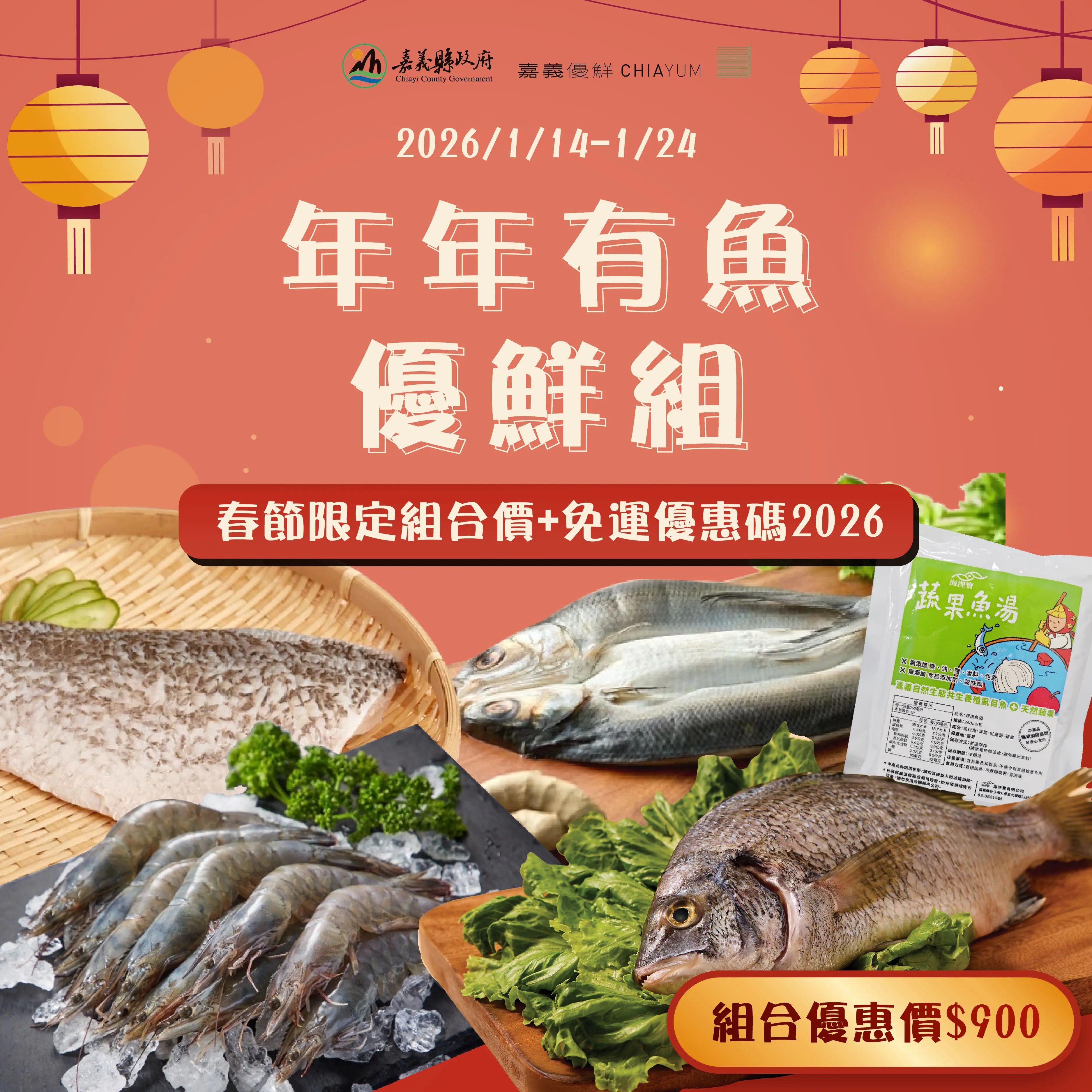 為迎接農曆春節到來,嘉義縣政府嘉義優鮮水產電商平台推出「過年回嘉漁你團圓」年節主題活動,攜手在地13家優質水產品牌,推出多元的低熱量、高蛋白質的水產年菜組合優惠,並加碼回饋全館免運,即日起至1月24日受理預購,歡迎鄉親踴躍選購。