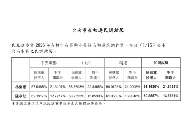 民主進步黨2026年台南市長初選民調結果今(15)日正式出爐,立法委員 陳亭妃 在與同黨立委 林俊憲 的激烈競逐中,以整體平均約2個百分點的些微差距勝出,確定將代表 民主進步黨 角逐2026年台南市長大位,民進黨也將正式進入「市長選戰模式」。