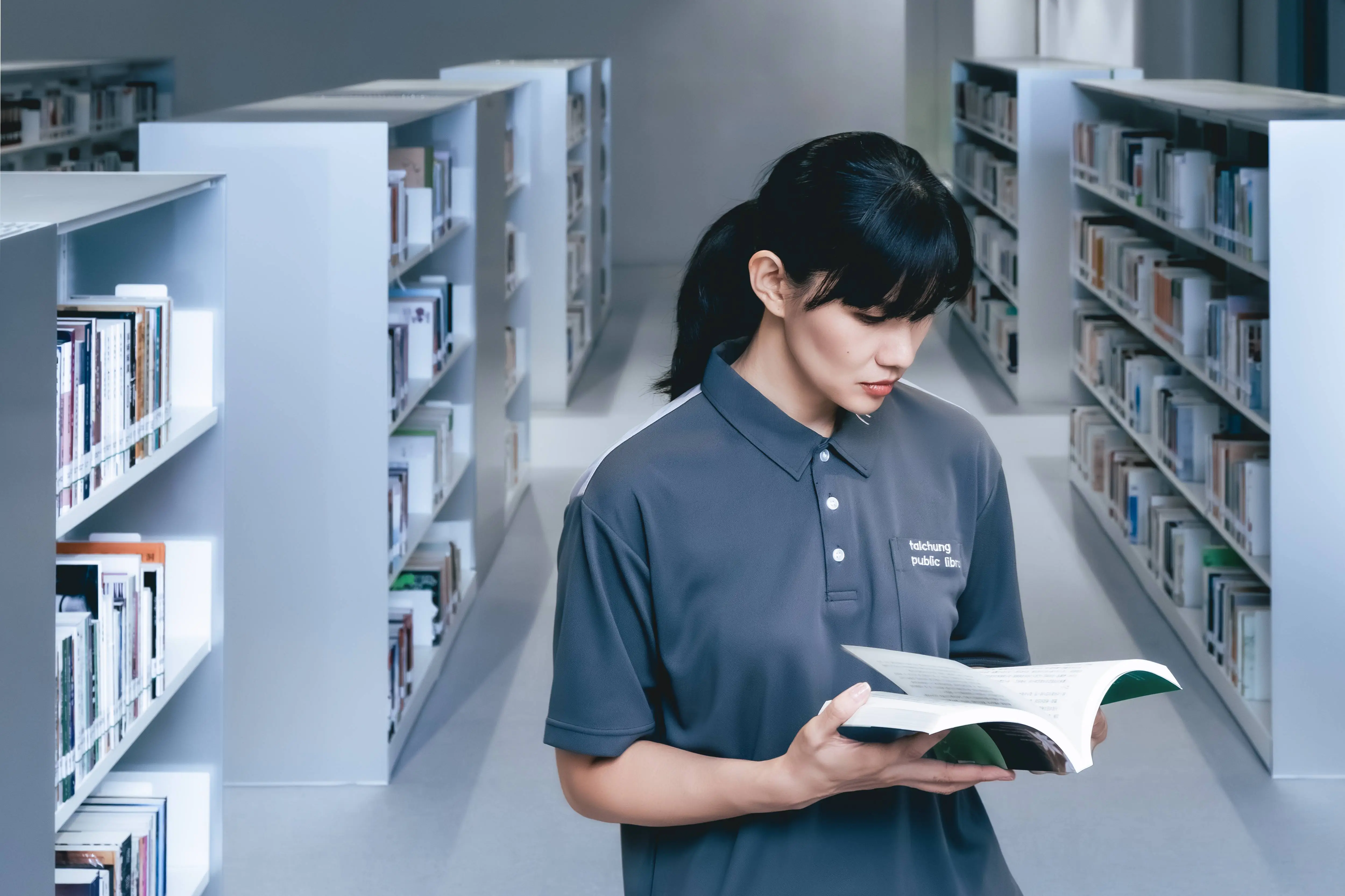 臺中市立美術館館長賴依欣表示,工作服設計融入館舍元素與概念巧思,兼顧實用性與美感,不僅呼應建築空間的乾淨調性,藍色不規則剪裁也讓館員與志工在行走之間,如同流動於空間中的色彩筆觸,向觀眾傳遞與藝術相遇的美好期待,同時提升服務識別度。臺中市立圖書館館長曾惠君則指出,圖書館制服以深色基調與俐落線條展現專業與優雅,兼顧美感與機能性,也映照出閱讀場域所蘊含的沉靜氛圍。
