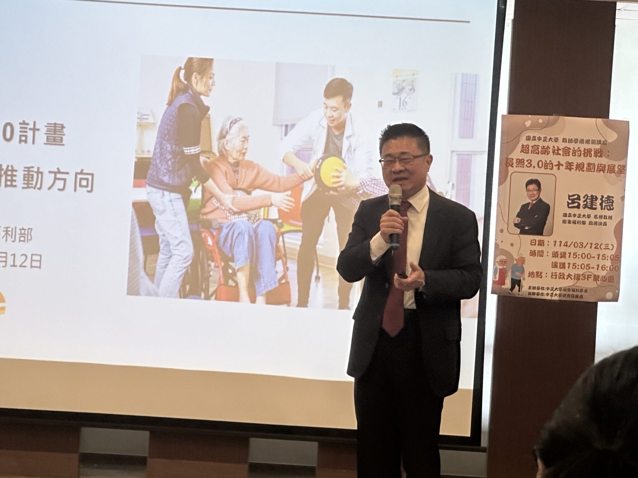 呂建德於頒授典禮後發表專題演講,主題為「超高齡社會的挑戰:長照3.0的十年規劃與展望」,深入探討臺灣高齡化趨勢與長照政策未來發展方向。他指出,長照3.0將在長照2.0基礎上,強調「全人連續性服務」,並設定八大發展目標,涵蓋健康促進、醫療整合、家庭支持、智慧照顧、安寧善終及人力專業發展等,期望建構更完善的長期照顧體系。