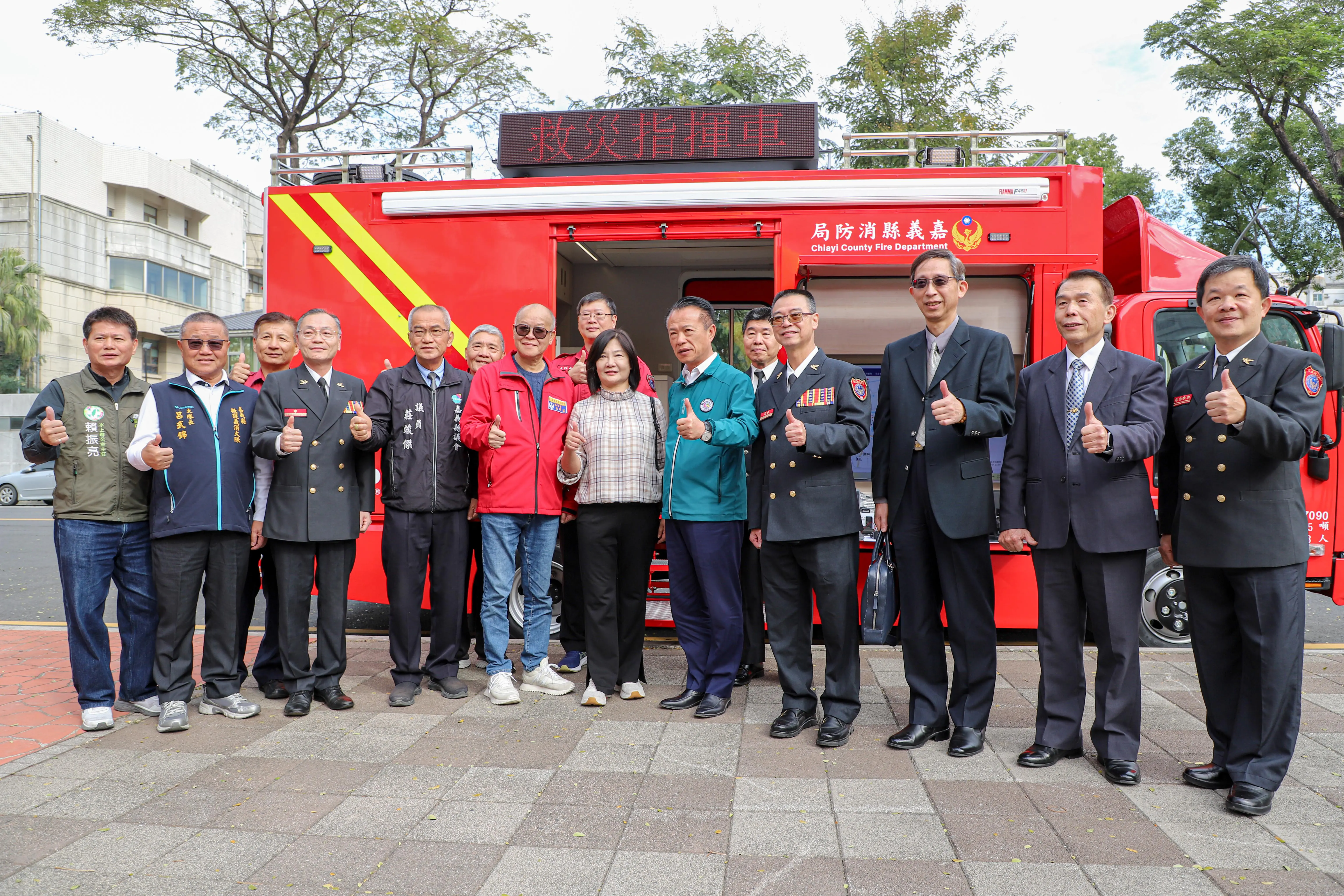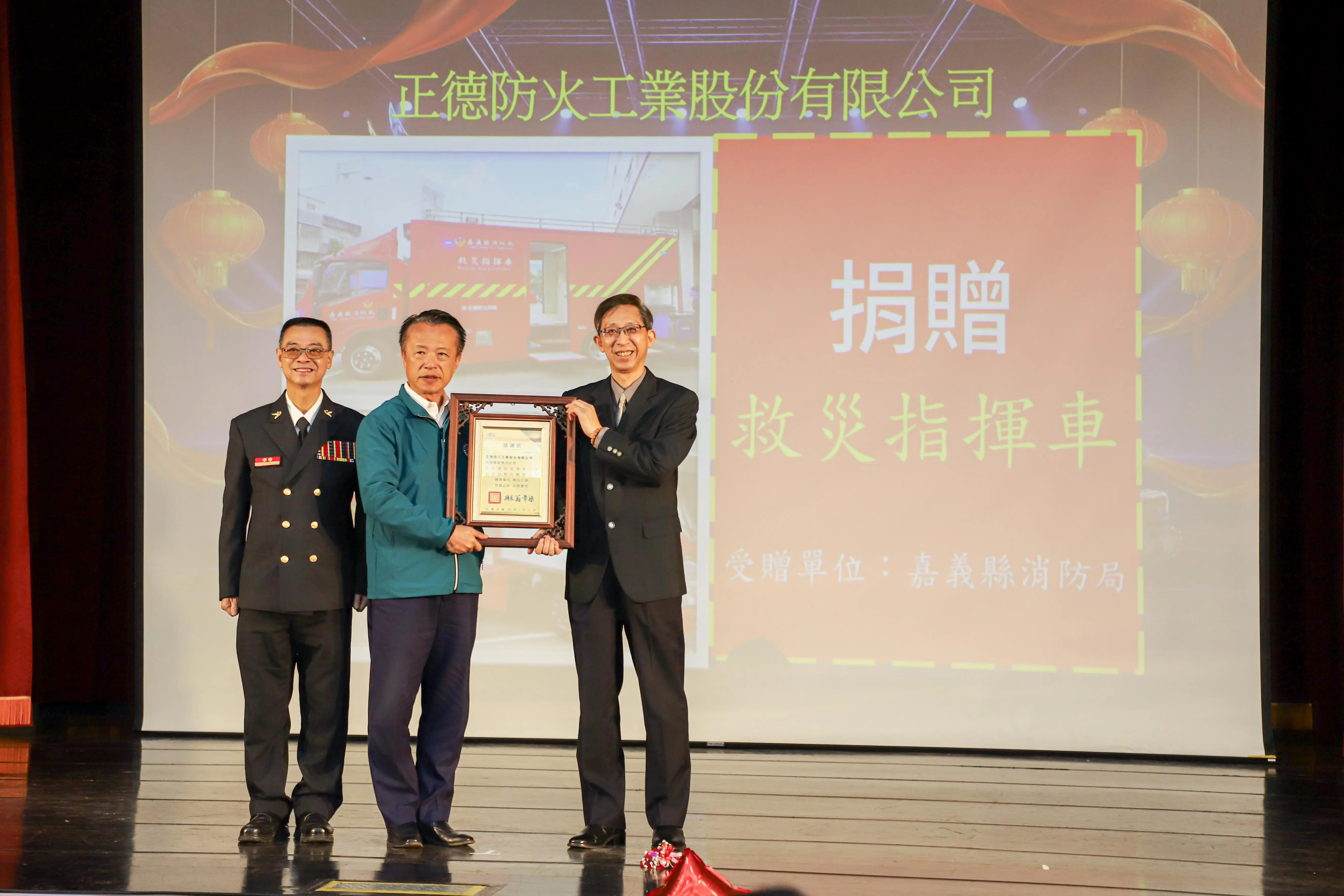 正德防火工業股份有限公司董事長郭貴蓉及總經理翁林泱在典禮中捐贈造價600萬的救災通訊指揮車,指揮車內部配備多項科技設備,能掌握消防員動向,提升執勤滅火效率與安全性。