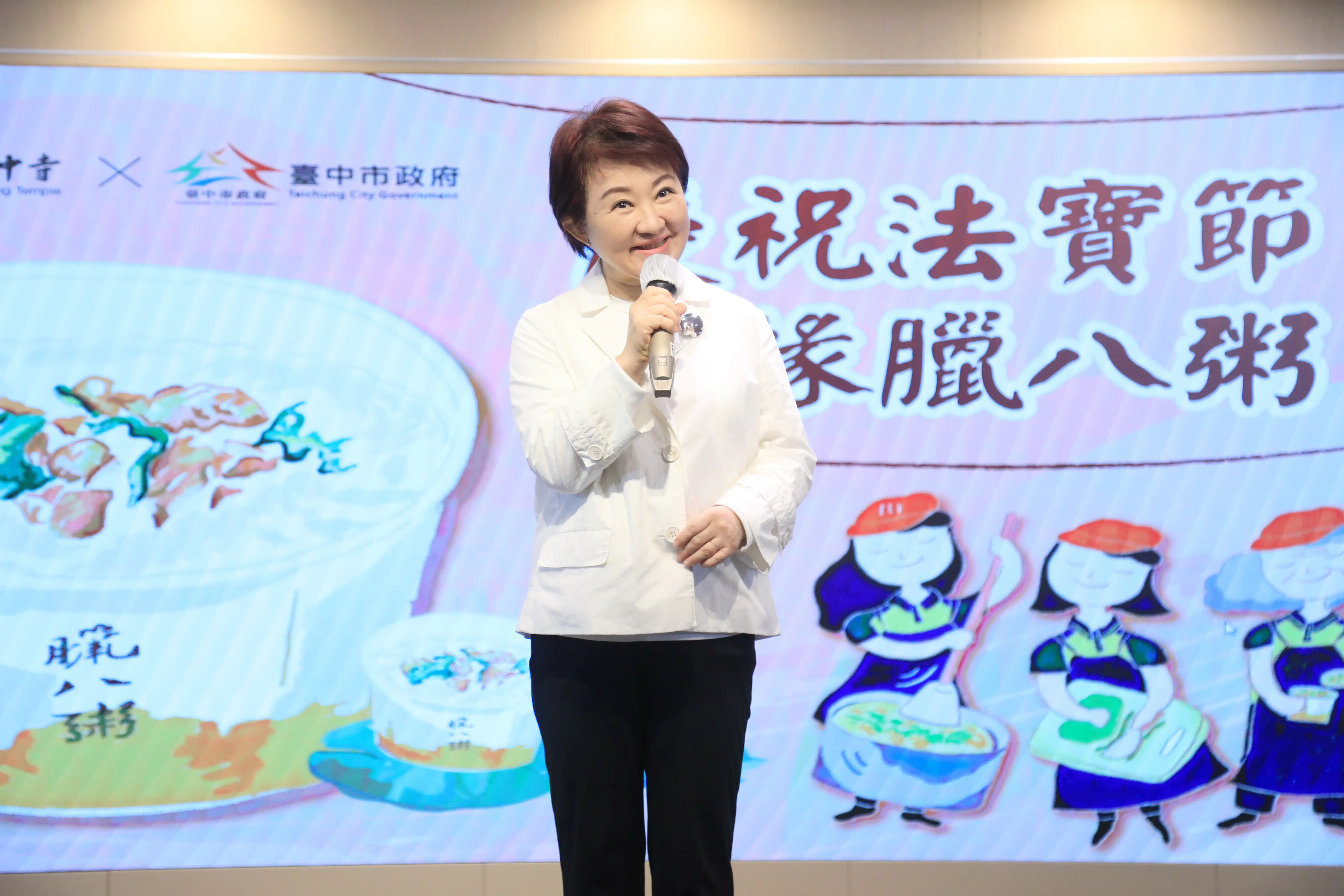 佛光山惠中寺為感謝台中市政府團隊長期對市政的努力,今(19)日在台灣大道市政大樓惠中樓舉辦「佛光山惠中寺慶祝法寶節結緣臘八粥活動」贈粥儀式,該寺準備數千杯美味的臘八粥、春聯及馬年紅包致贈市府員工。台中市長盧秀燕代表市府團隊感謝寺方的用心,一碗臘八粥象徵平安、吉祥,是市府同仁每年最期待的溫暖心意。