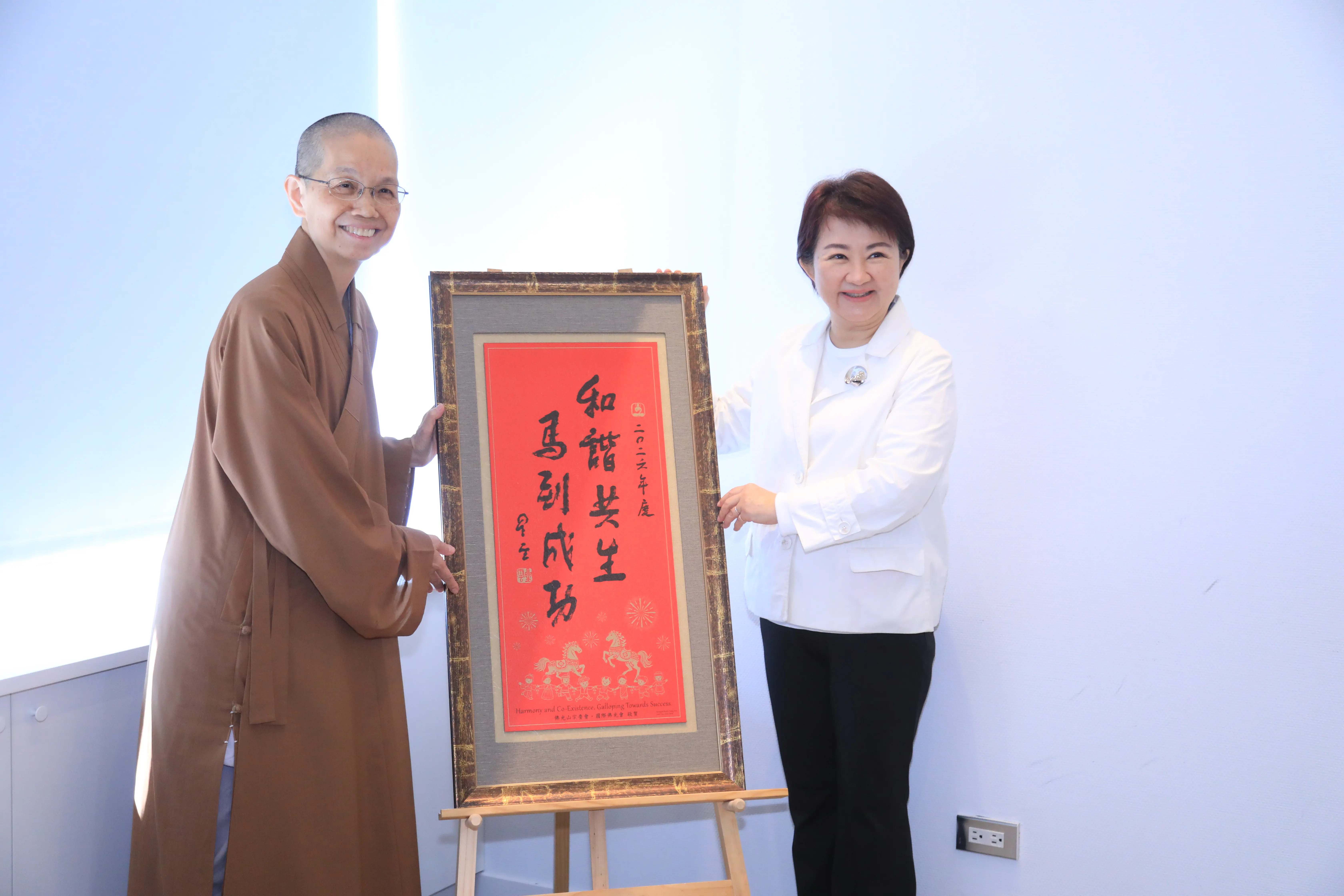 覺居法師表示,惠中寺每年送上臘八粥,不僅是祝福也是感謝。今年星雲大師春聯主題為「和諧共生、馬到成功」,象徵社會需以和諧為基礎才能共榮,她也以臘八粥多元食材比喻團隊合作,唯有彼此協調、缺一不可,才能成就最佳成果,社會才能共生共榮。覺居法師也肯定市府團隊在盧市長帶領下,展現和諧精神,並送上最誠摯的祝福。會後盧市長邀請覺居法師一行前往市長貴賓室協助「換裝」,將今年星雲大師春聯、市府春聯與吉祥物擺設在市長貴賓室,為市民、市府團隊祈福。