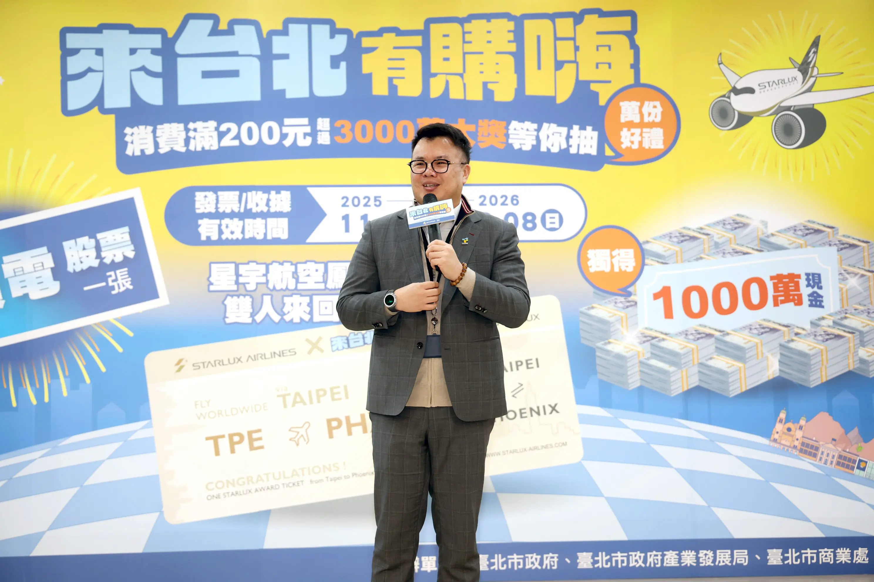 這次記者會現場驚喜CALL OUT連線星宇航空「台北-鳳凰城」雙人來回機票幸運得主鄭女士,由陳俊安局長親自報喜,中獎人接到電話時起先有些遲疑,直到確認中獎後難掩聲音中的驚喜與感動,真實流露的情緒感染全場,也為歲末年終的消費話題再掀熱潮。市府表示透過多元且具代表性的獎項設計,讓消費不只是消費,更成為民眾與城市之間的美好連結。從飛往美國的夢想旅程、象徵投資價值的台積電股票,到貼近日常的生活型好禮,市府期盼在新的一年,以實質、有感的回饋,陪伴市民一起感受臺北的溫度與活力。