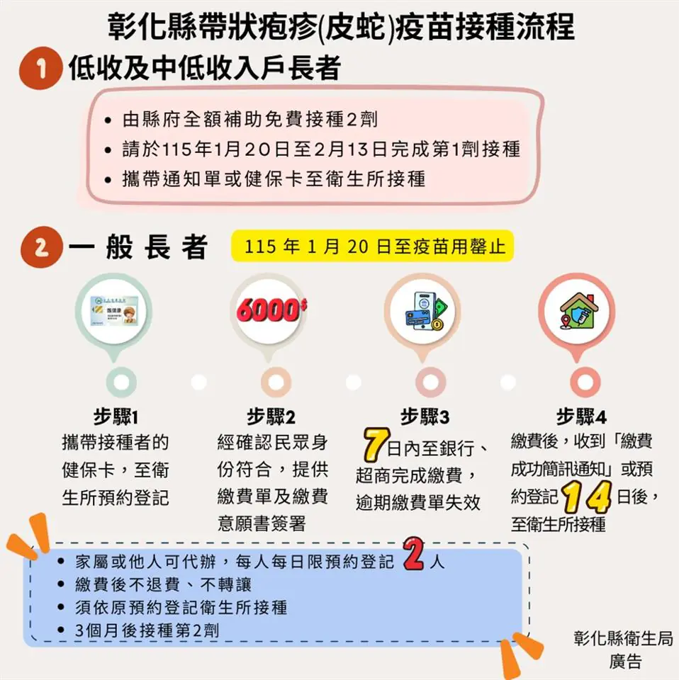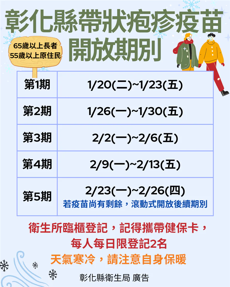 彰化縣政府守護長者健康,帶狀疱疹(皮蛇)疫苗接種計畫將於115年1月20日正式啟動,接種預約預計分五期,若疫苗尚有剩餘,將滾動式加開後續期別。縣府自購2萬劑疫苗,提供設籍彰化縣一年以上1萬名65歲(含原住民55歲) 長者施打兩劑完整保護,低收入及中低收入戶長者免費由縣府全額補助;一般長者則自付6,000元,其餘不足部分由縣府補助。為確保接種秩序並配合作業,本次計畫採「同步開放預約、分批有序接種」模式。彰化縣長王惠美呼籲長者踴躍施打,提升個人保護力,並提醒早晚溫差大,前往衛生所務必做好防寒措施。