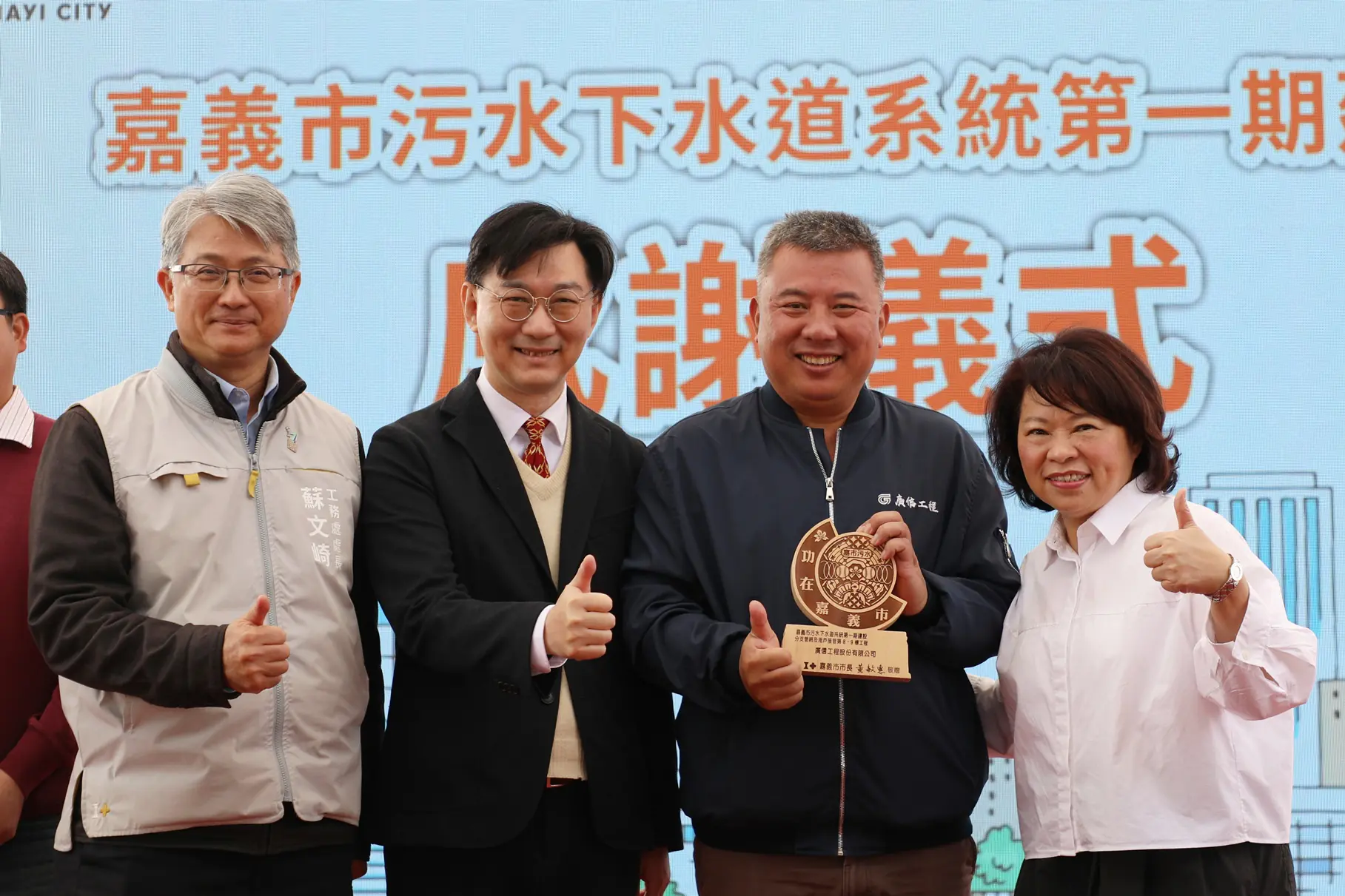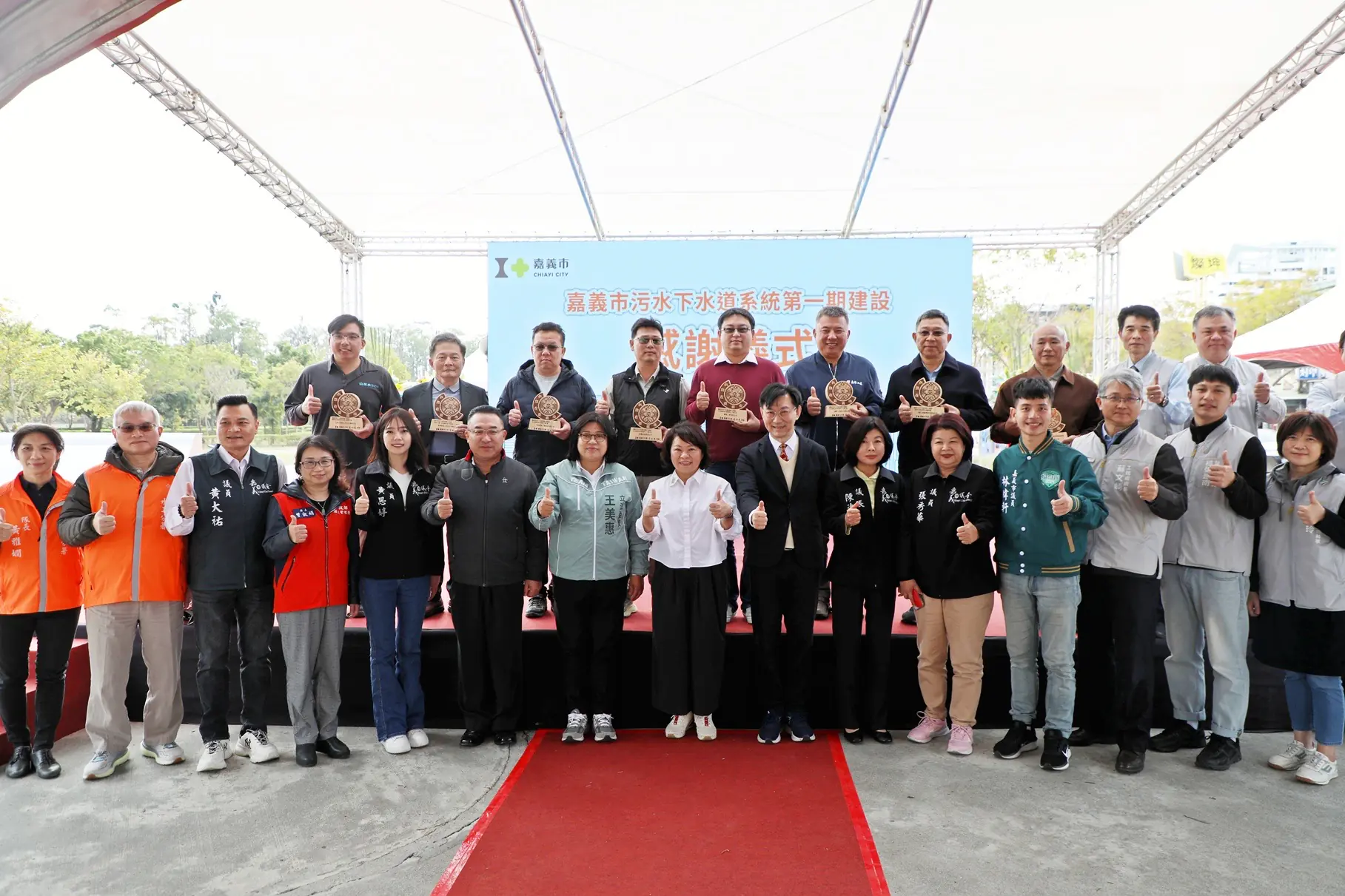 嘉義市政府積極推動污水下水道建設,落實雨污水分流、減少病媒傳播。今(21)日於北香湖公園辦理污水系統第一期第8、9標工程竣工典禮,代表嘉義市污水系統第一期工程完工,黃敏惠市長與內政部董建宏政務次長、民意代表共同出席見證此歷史性的一刻,並於典禮中頒發獎牌感謝嘉義市污水一期建設有功廠商。