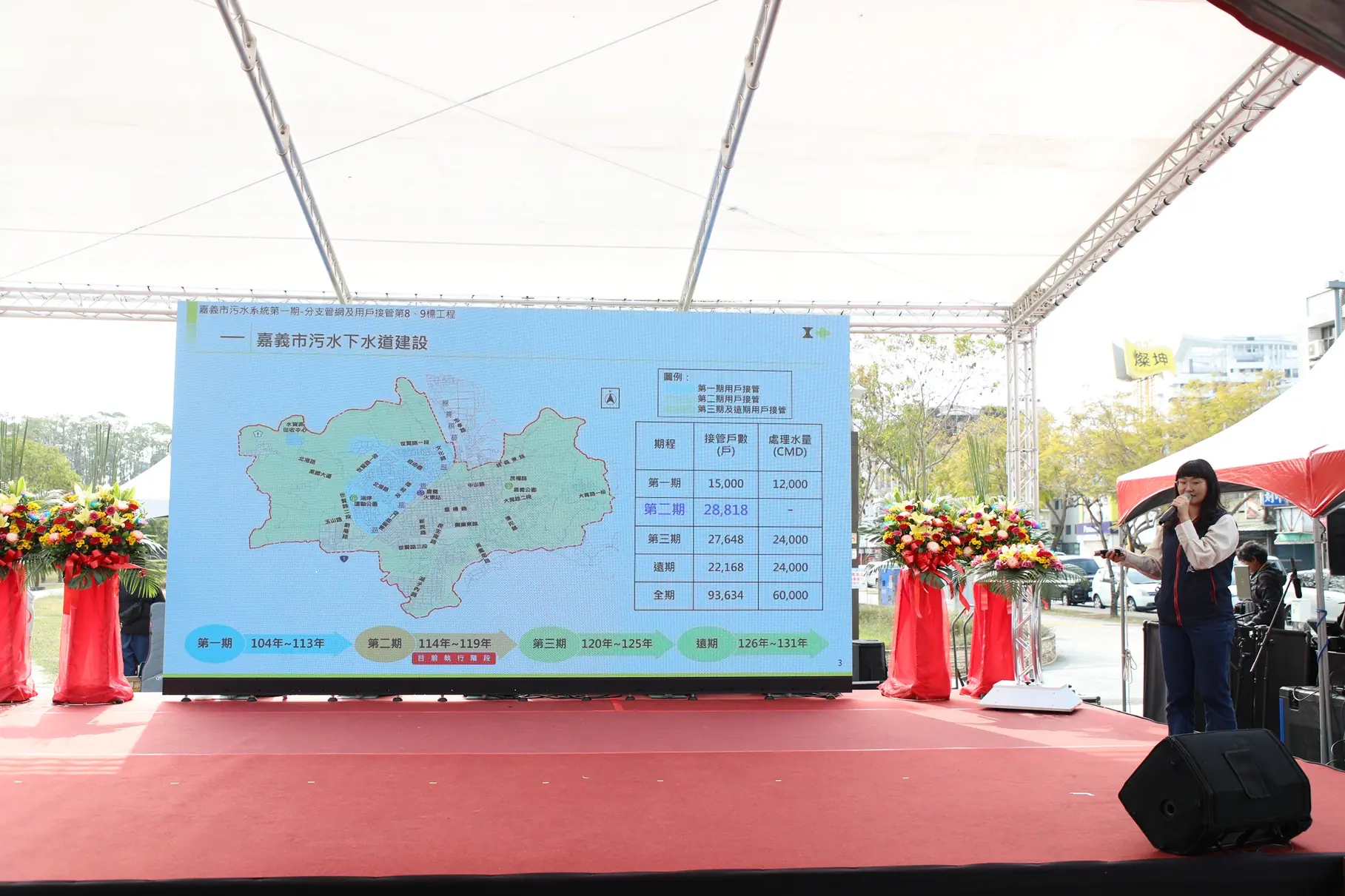 黃敏惠市長表示,污水下水道工程是城市裡看不見的隱形建設,卻是文明城市之重要指標,感謝中央及內政部的支持與指導,特別感謝董建宏政務次長對嘉義市建設的支持,以及議會、立委與各里長協助推動。市府團隊在第一期建設計畫克服諸多挑戰,期程104到113年,總經費計43.69億,雖曾面臨部分住戶接受度不高的挑戰,但在市府團隊積極努力下,成功完成11標案的污水下水道工程建設,已完成15,922戶用戶接管,並自110年至113年連續四年榮獲內政部國土管理署全國污水下水道建設計畫考核評鑑第三組第1名與普及率年增率全國第一佳績。