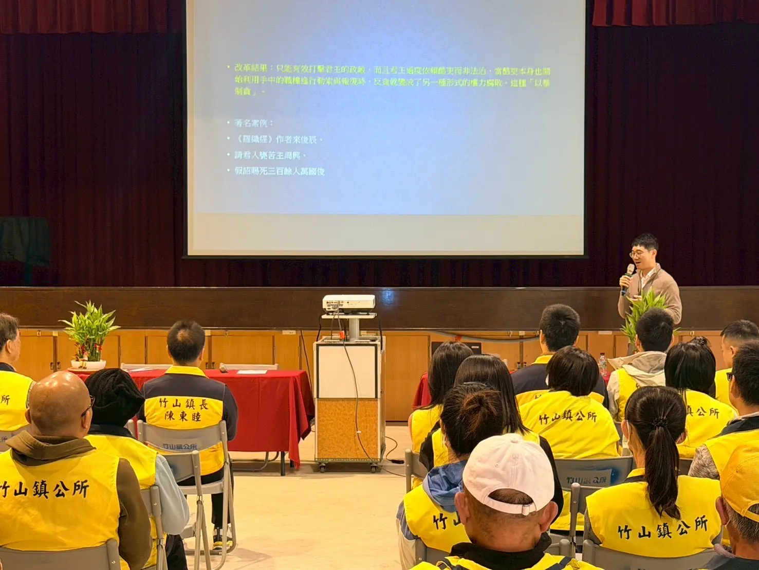 南投縣竹山鎮公所為強化公務員法治觀念與自我保護意識,打造勇於任事不畏困難的公務環境,本月21日於公所大禮堂舉辦「公務員面對司法調查與阻卻違法」廉政課程,邀請臺灣南投地方法院李松諺法官擔任講座,宣導內容豐富且實用,獲得熱烈回響。