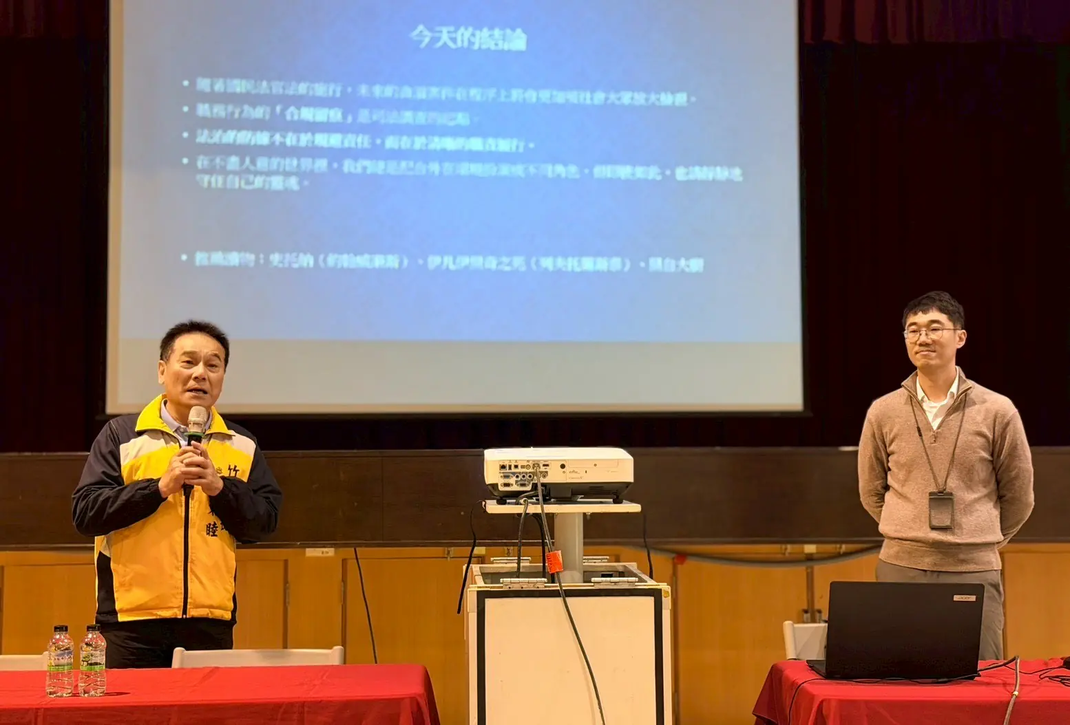 竹山鎮長陳東睦表示,公務員雖恪盡職守,但可能因業務牽連而須面對司法調查。透過實務導向的廉政宣導活動,協助公務員正確認識法律責任與保障機制,不僅是保護公務員本身,更打造廉潔、效率、負責的公務環境,有助於提升整體行政效能與民眾對公所施政的信賴;國民法官制度象徵司法更貼近人民、也更公開透明,透過今天的課程,讓公所同仁不只是「知道制度」,而是「理解制度」,更能進一步內化成依法行政與尊重程序的工作態度。