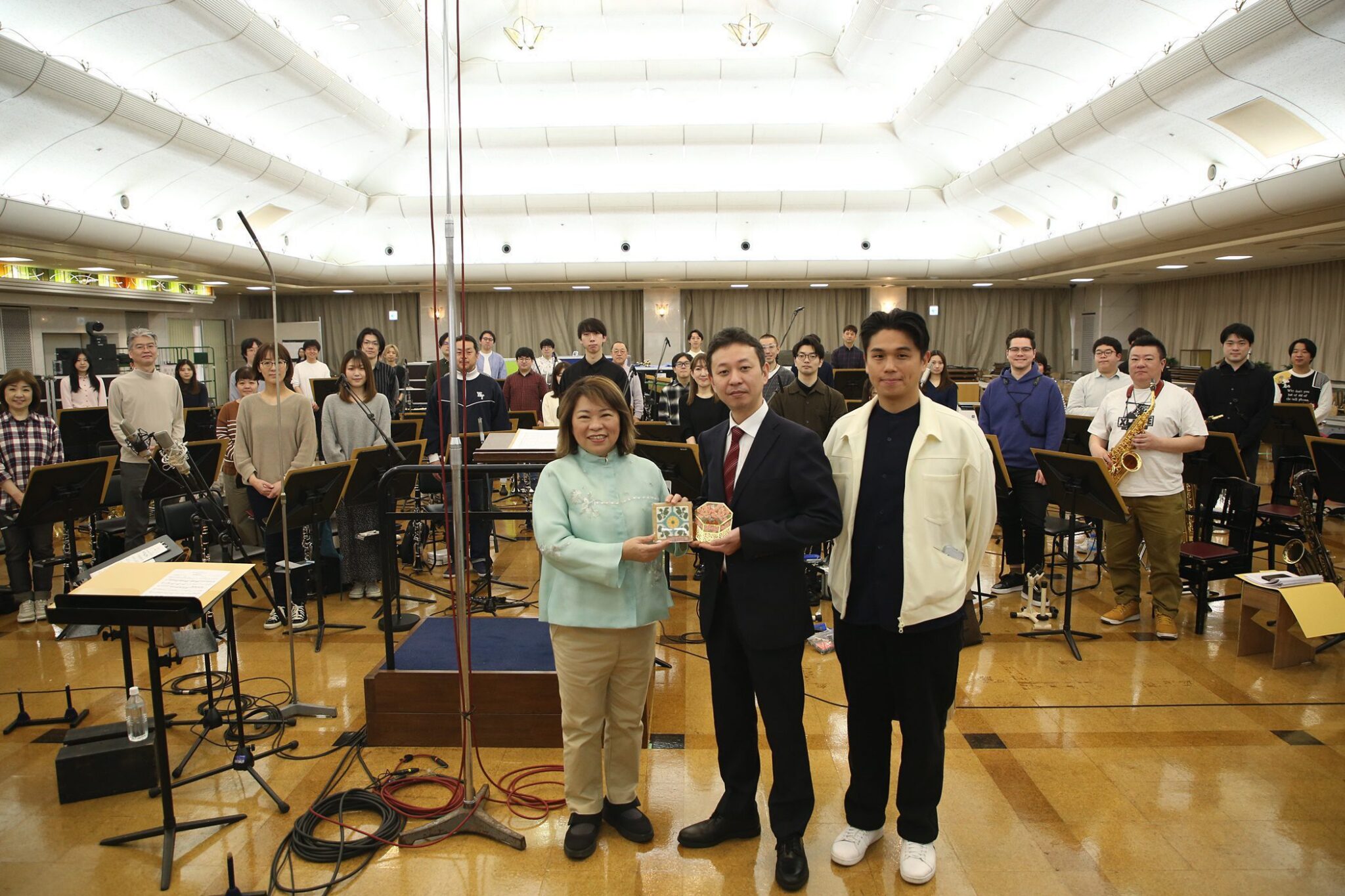 東京佼成管樂團理事長勝川本久也特別來到錄音室一起歡迎黃市長蒞臨,勝川理事長對兩團的合作錄音讚嘆不已。對於嘉頌團員與東京佼成美麗的音樂故事,更讓他感到無比光榮,並且受到很大的鼓勵。勝川本久理事長強調,音樂的影響力不僅能改變人生,也能塑造未來。勝川本久理事長回憶,早在2000年與2011年到訪嘉義市時,就深刻感受到嘉義市民的熱情與接待人員細心的照顧,當時在嘉義演出的樂器也都是台灣當地借用,他對此溫暖的友誼留下難忘的回憶。勝川本久表示,日本與台灣本就擁有深厚的情誼,而嘉義市的溫暖更讓他感受到格外親切,他會努力促成今年東京佼成管樂團再赴嘉義市的演出行程,促進雙方更進一步交流。