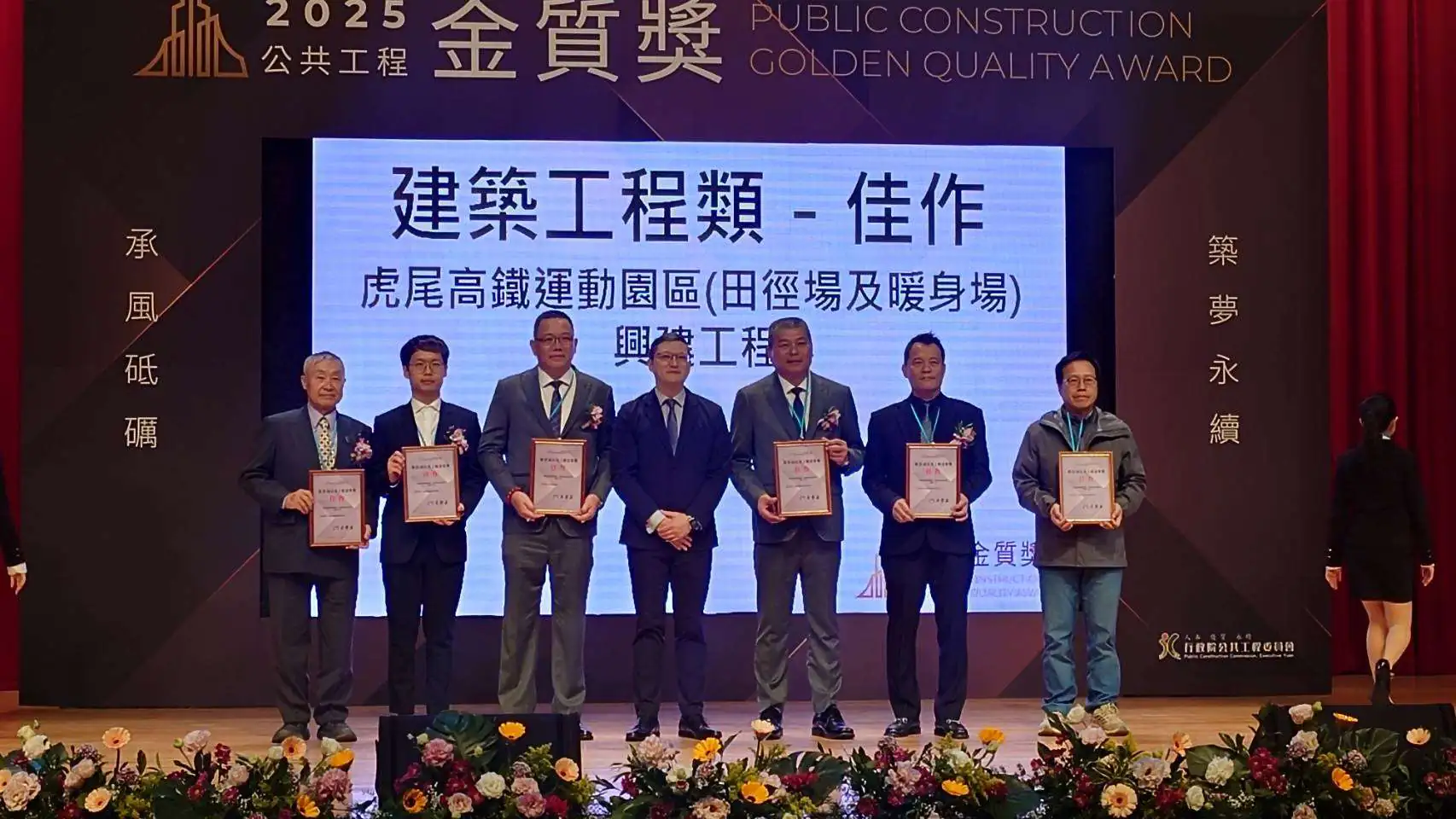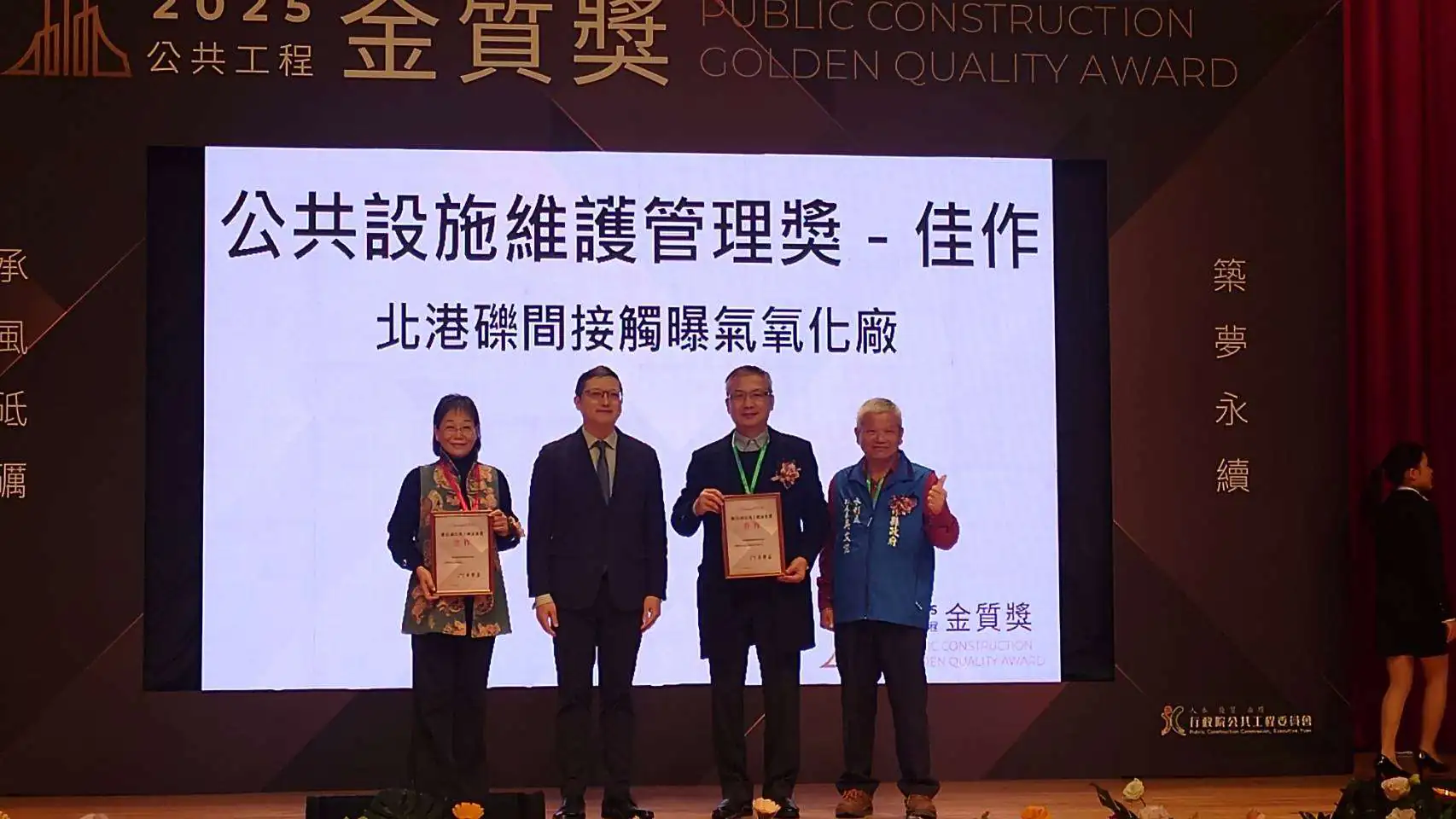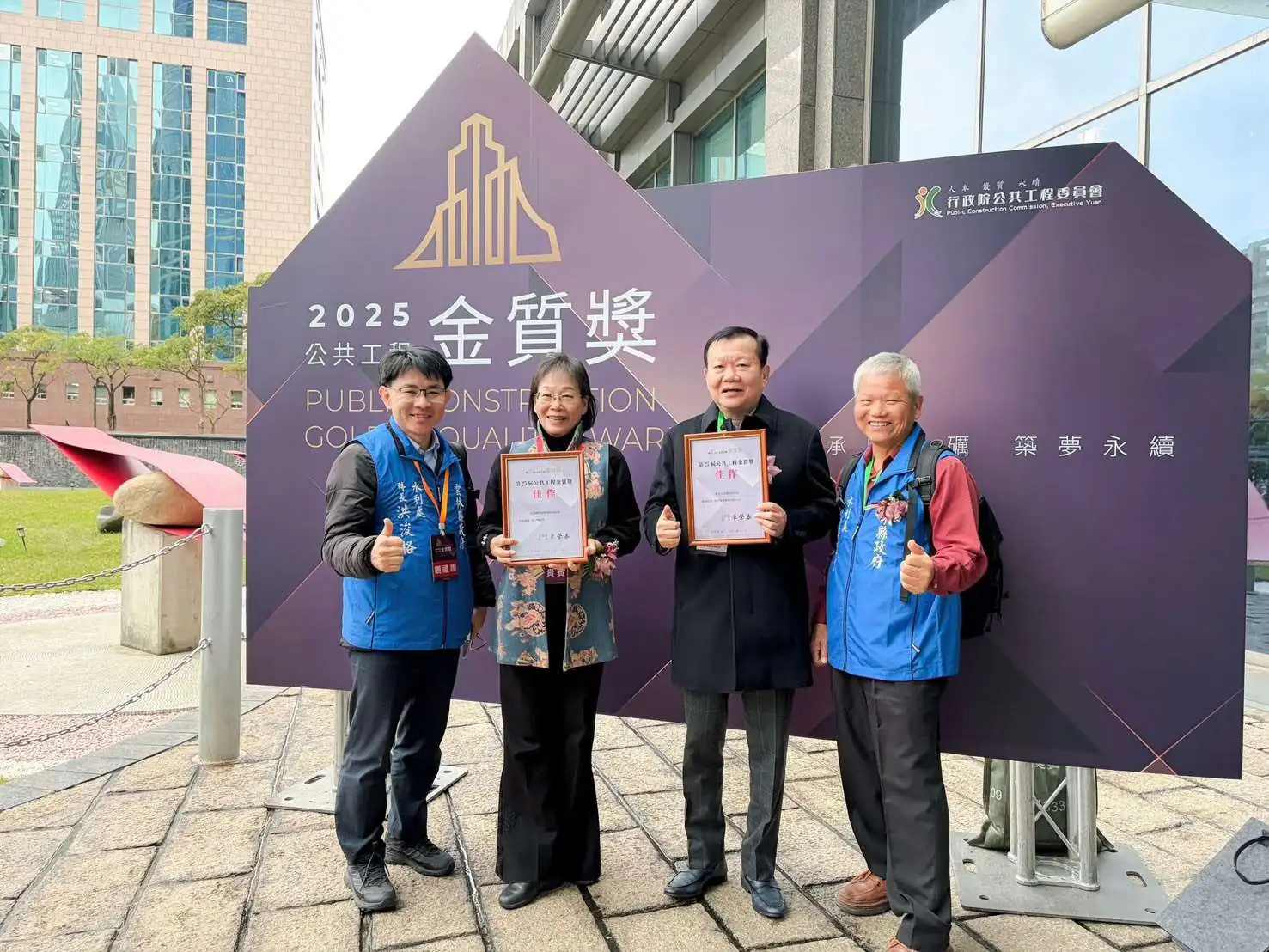 有「工程界奧斯卡獎」美譽的行政院公共工程委員會公共工程金質獎於去(114)年12月27日公布,雲林縣立田徑場、雲92-1(芒果大道)拓寬工程及北港礫間接觸曝氣氧化廠,拿下建築類、土木類及公共設施管理維護類三項獎項。今(1/21)日由謝淑亞副縣長率交通工務局汪令堯局長、水利處吳文能副處長,工程團隊等人至公共工程委員會領獎,公共工程金質獎分為土木、水利、建築、設施等類別進行評選,在競爭激烈中獲委員肯定,展現雲林縣工程實力的進步。