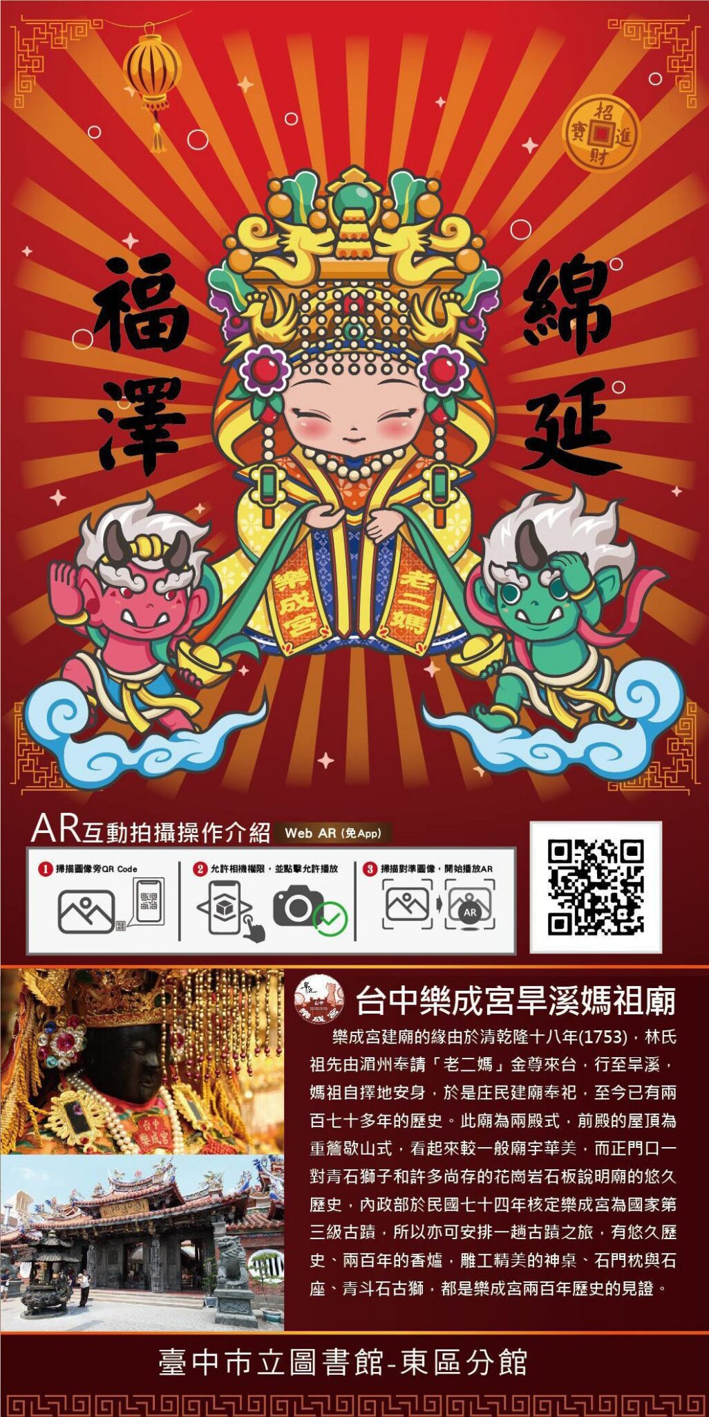 文化局表示,東區圖書館長期深耕地方,並攜手社區、學校及宮廟推廣閱讀與文化,此次特別與樂成宮合作推出「跟媽祖說Hi」AR影像互動體驗。活動獲樂成宮授權使用媽祖、千里眼、順風耳圖檔,並由僑光科技大學多媒體與遊戲設計系洪炎明老師精心創作。透過AR技術,參加者可使用手機或平板,與Q版媽祖、千里眼、順風耳跨時空互動,獲得科技與信仰融合所帶來的獨特體驗。