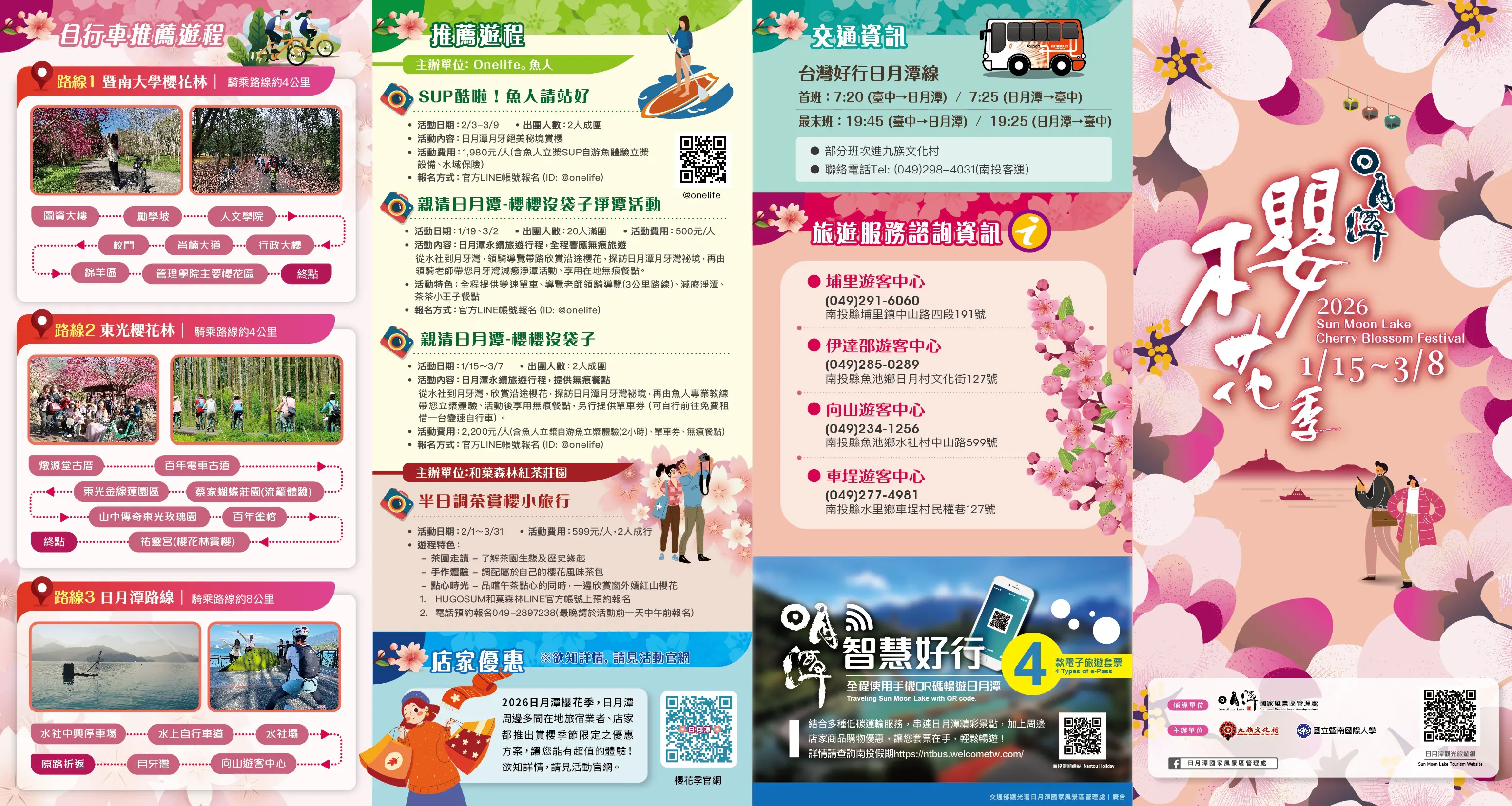 日管處表示,為響應永續觀光,今年櫻花季特別推出「搭好行抽好禮」活動。自即日起至 3月8日止,民眾只要搭乘台灣好行日月潭線、車埕線等指定路線,並於合作店家消費滿額,即有機會抽中投影機、吸塵器及住宿券等大獎。