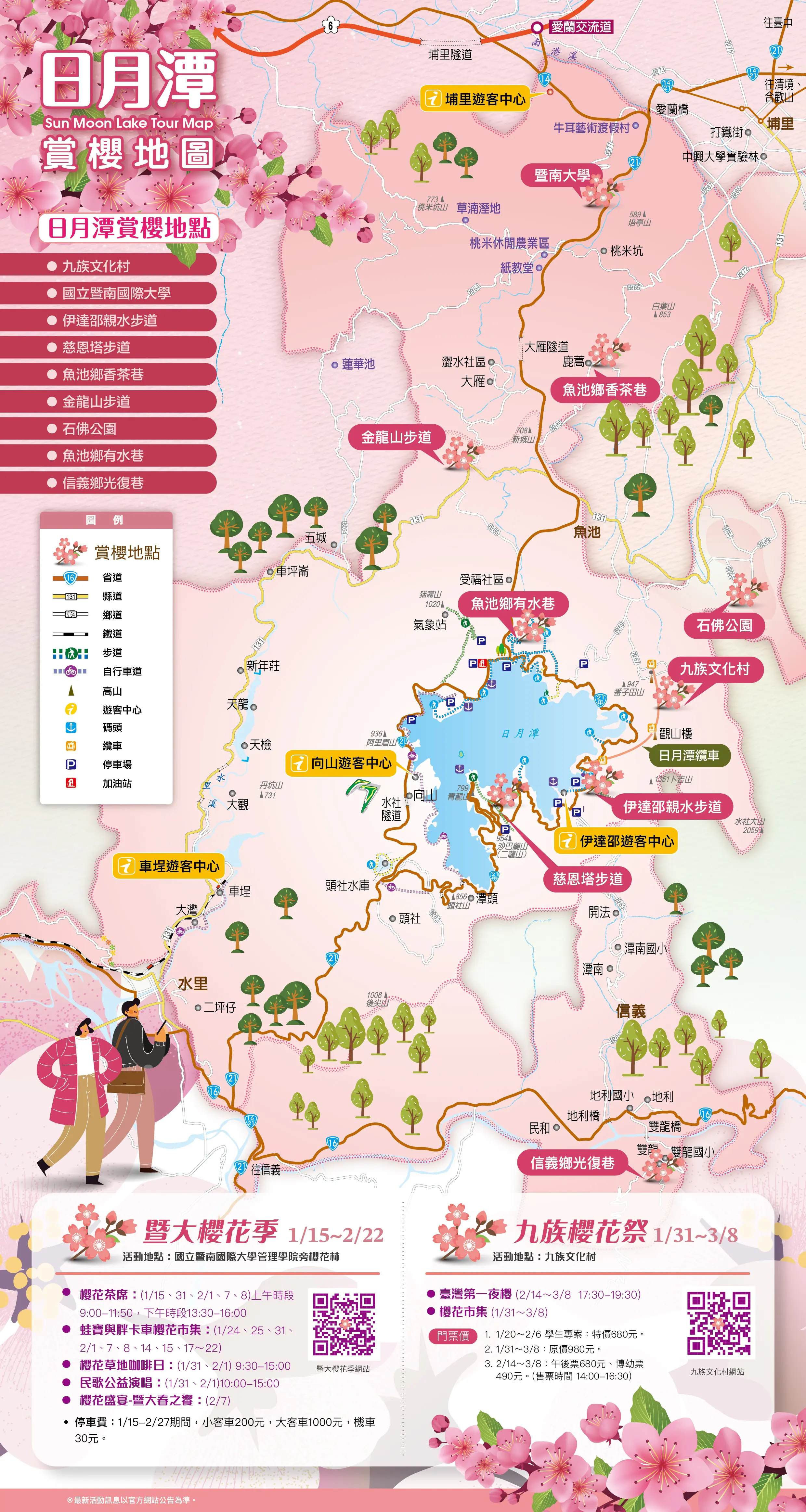 全台期待已久的年度盛事「2026日月潭櫻花季」正式揭開序幕!日月潭兩大賞櫻勝地「九族文化村」、「國立暨南國際大學」及協同在地產業,以超過五千株櫻花的粉紅花海為背景,搭配周邊限定遊程、店家優惠及搭好行抽好禮,邀請國內外遊客一同感受日月潭地區的浪漫春色。