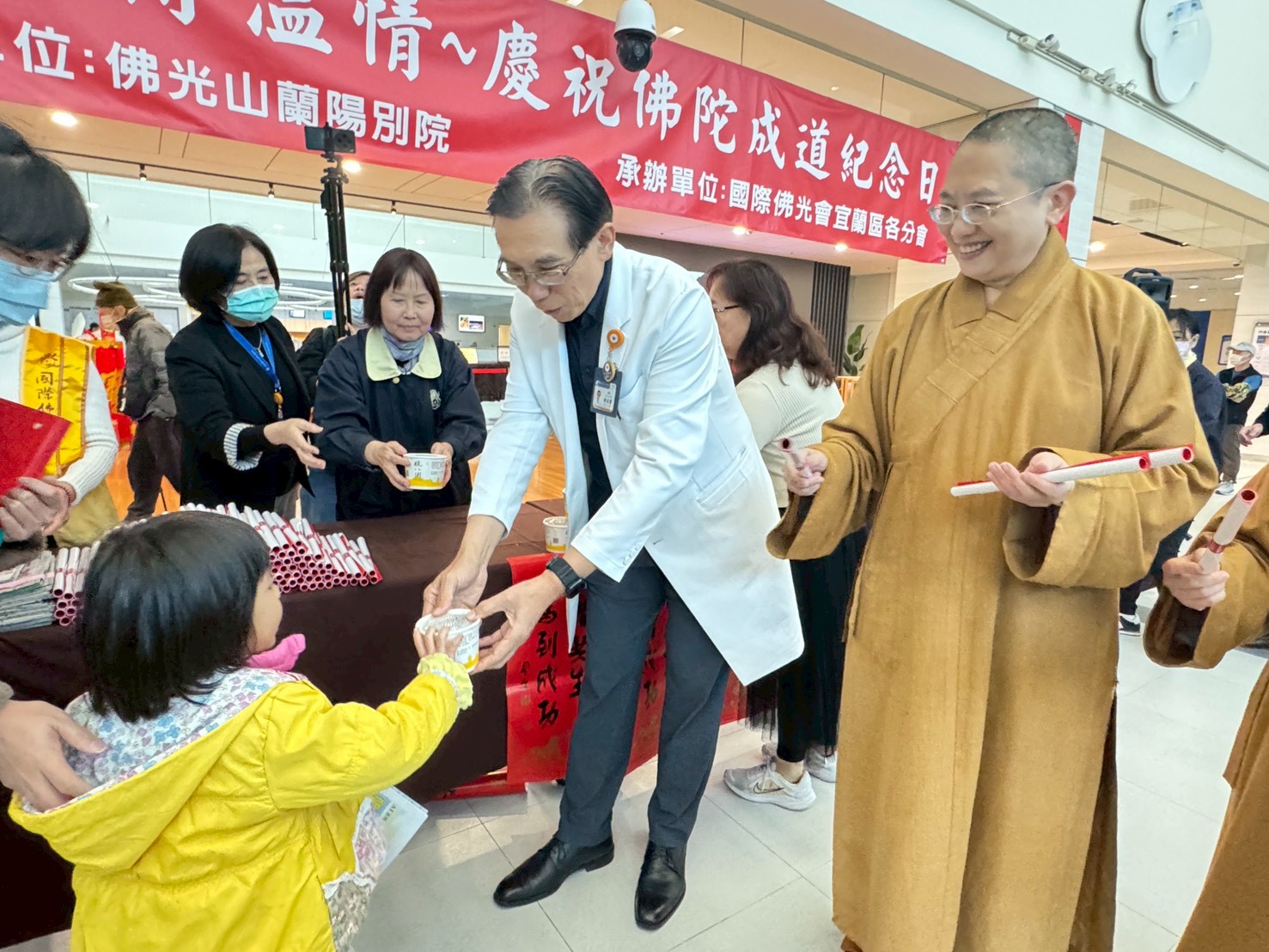 宜蘭佛光山蘭陽別院在佛陀成道日暨法寶節之際,22日假陽明交大醫院蘭陽院區一樓大廳共同辦理「臘八贈粥.馬上暖心」贈粥活動,由妙勤住持親送臘八粥,送上暖心的祝福,並由黃志賢院長代表醫護團隊受贈,在最溫暖的臘八節時刻,讓病患、家屬及全院同仁都能法喜充滿、平安吉祥。