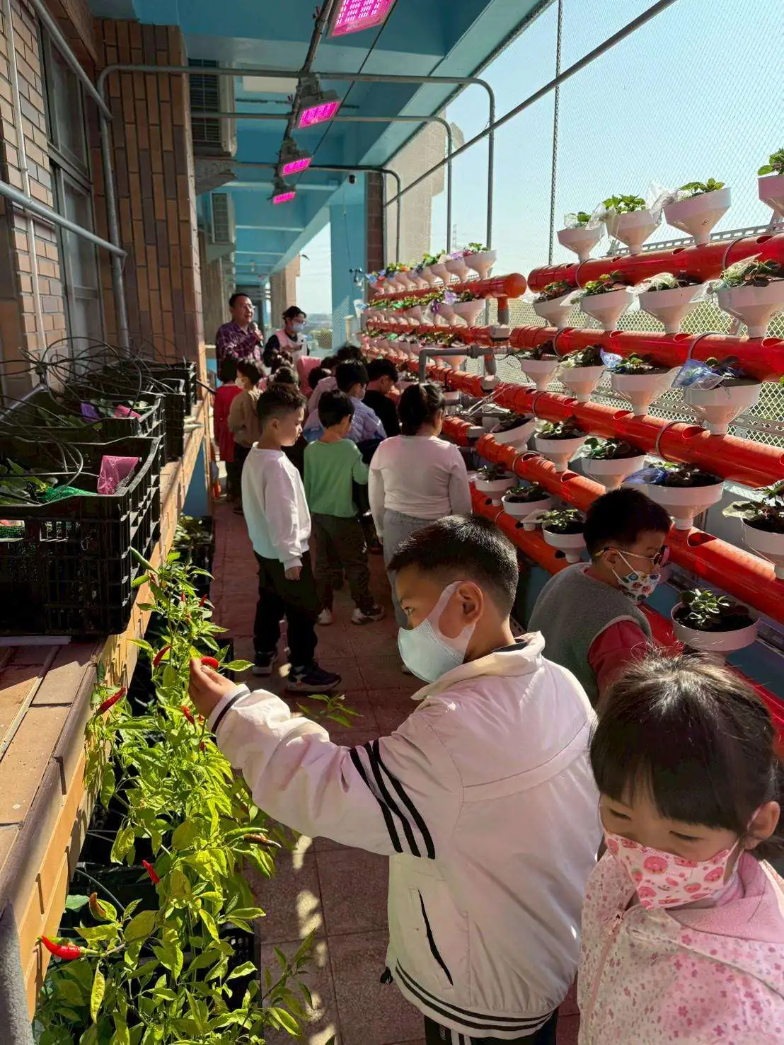 越港國小喬祺校長表示本次草莓栽培自114年12月初啟動,係農業處林承樺技正輔導智慧農業補助案場技術,實際落實於校園之實作示範。栽培過程結合新湖合作農場與巧盛工農業社等專業團隊技術指導,並導入臺大植物醫師提供之病蟲害防治建議,將縣府輔導之智慧農業實務經驗轉化為教學內容,落實「做中學、學中做」的教育理念。在農業處支持下,智慧農業館導入自動化灌溉系統、環境感測設備及植物燈等智慧化設施,透過精準控制水分、養分與光照條件,使作物在室內環境中穩定生長,有效降低氣候因素影響。學生藉由實際觀察與操作,理解AI與科技如何應用於農業生產管理,深化對智慧農業的認識。