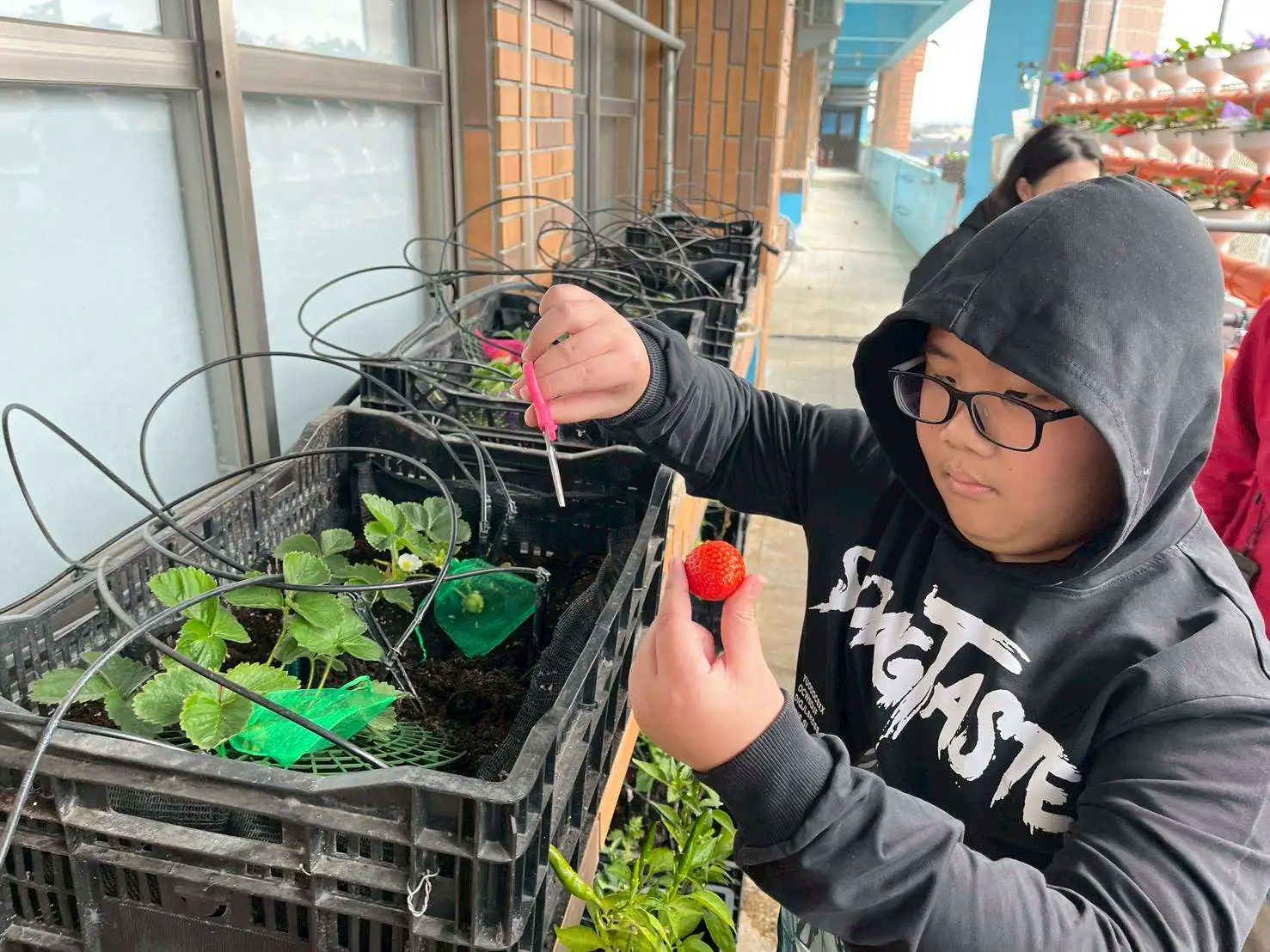 越港國小學生實地體驗草莓採收,透過親身觀察與操作,了解AI與科技在農業生產管理上的應用,深化對智慧農業的認識。