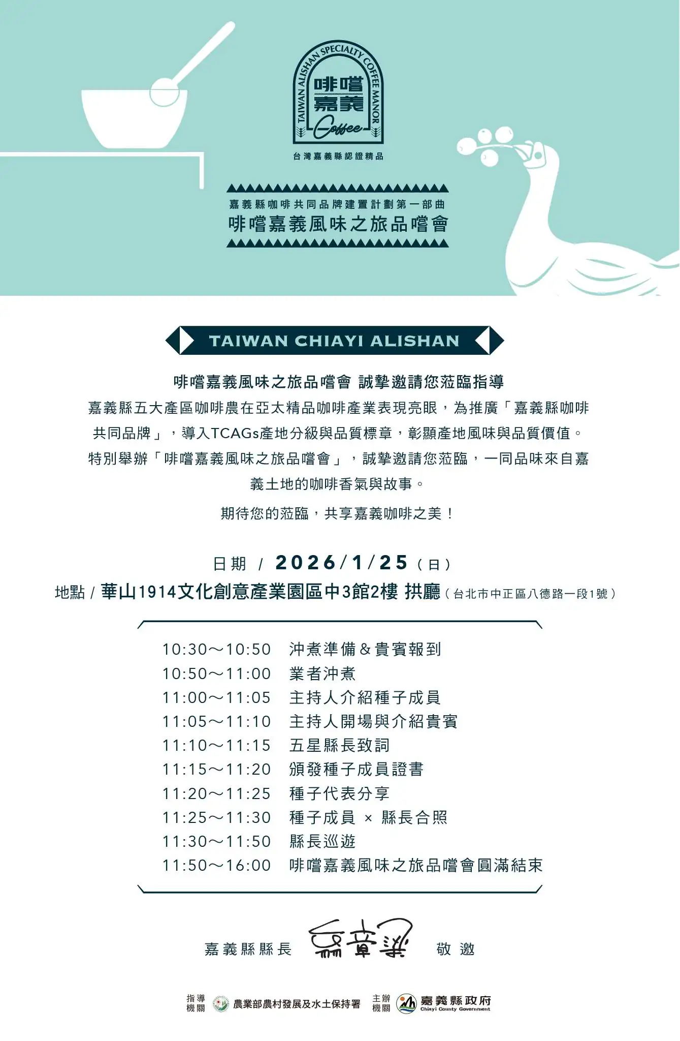 嘉義縣政府誠摯邀請咖啡愛好者、業界夥伴與國際友人1月25日蒞臨華山文創園區,見證台灣精品咖啡的專業實力與極致風味。