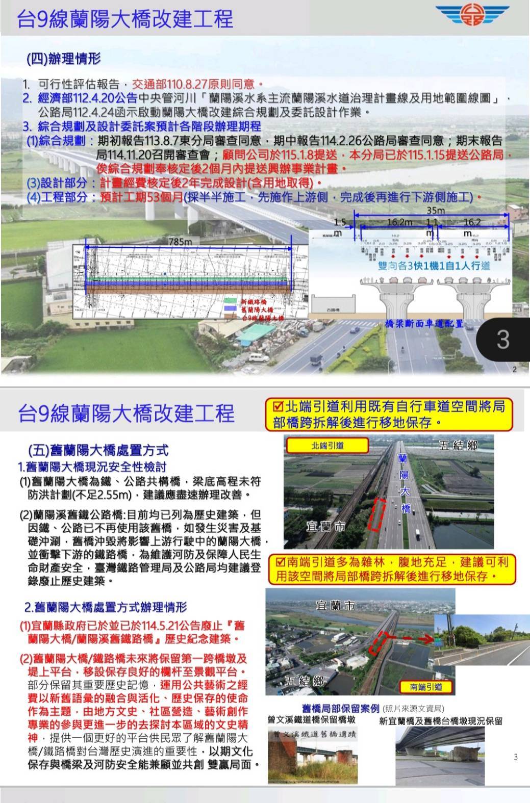 公路局表示,舊蘭陽大橋未來將保留第一跨橋墩及堤上平台,移設保存良好的欄杆至景觀平台,另解說設施及意象保留重要歷史記憶,由地方文史、社區營造、藝術創作專業的參與,進一步探討文史精神,提供一個更好的平台供民眾了解舊蘭陽大橋對台灣歷史演進的重要性,以期文化保存與橋梁及河防安全能兼顧並共創雙贏局面。
