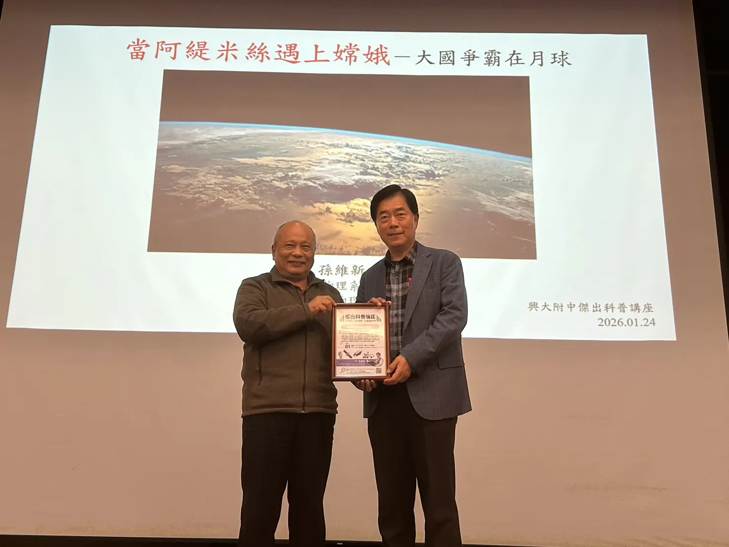 今日講座由科博館黃文山館長親自擔任引言人,孫維新教授在演講中以極具張力的敘事方式,帶領聽眾由20世紀冷戰時期的太空競賽開場,繼而深入剖析了21世紀美國以回歸月球為目標的「阿提米絲」(Artemis)計畫,以及中國進度神速、成功實施月背取樣的「嫦娥」系列工程。