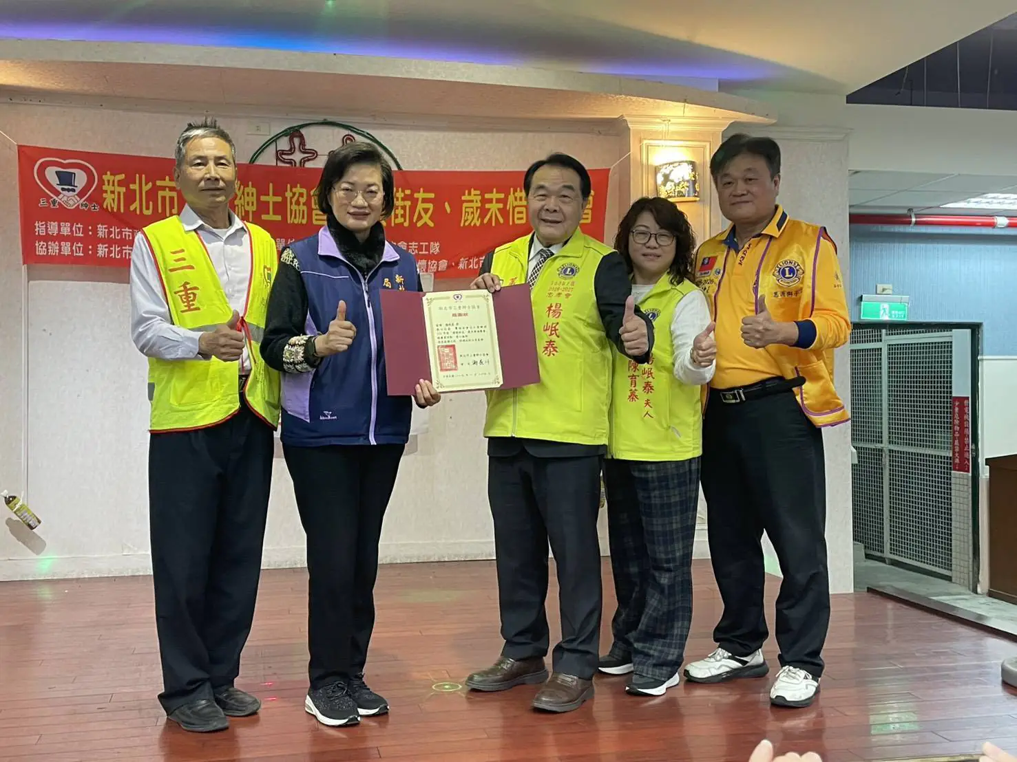 社會局長李美珍和主辦三重紳士協會會長謝長川(左1)致贈感謝狀給贊助的獅子會。(新北市社會局提供)