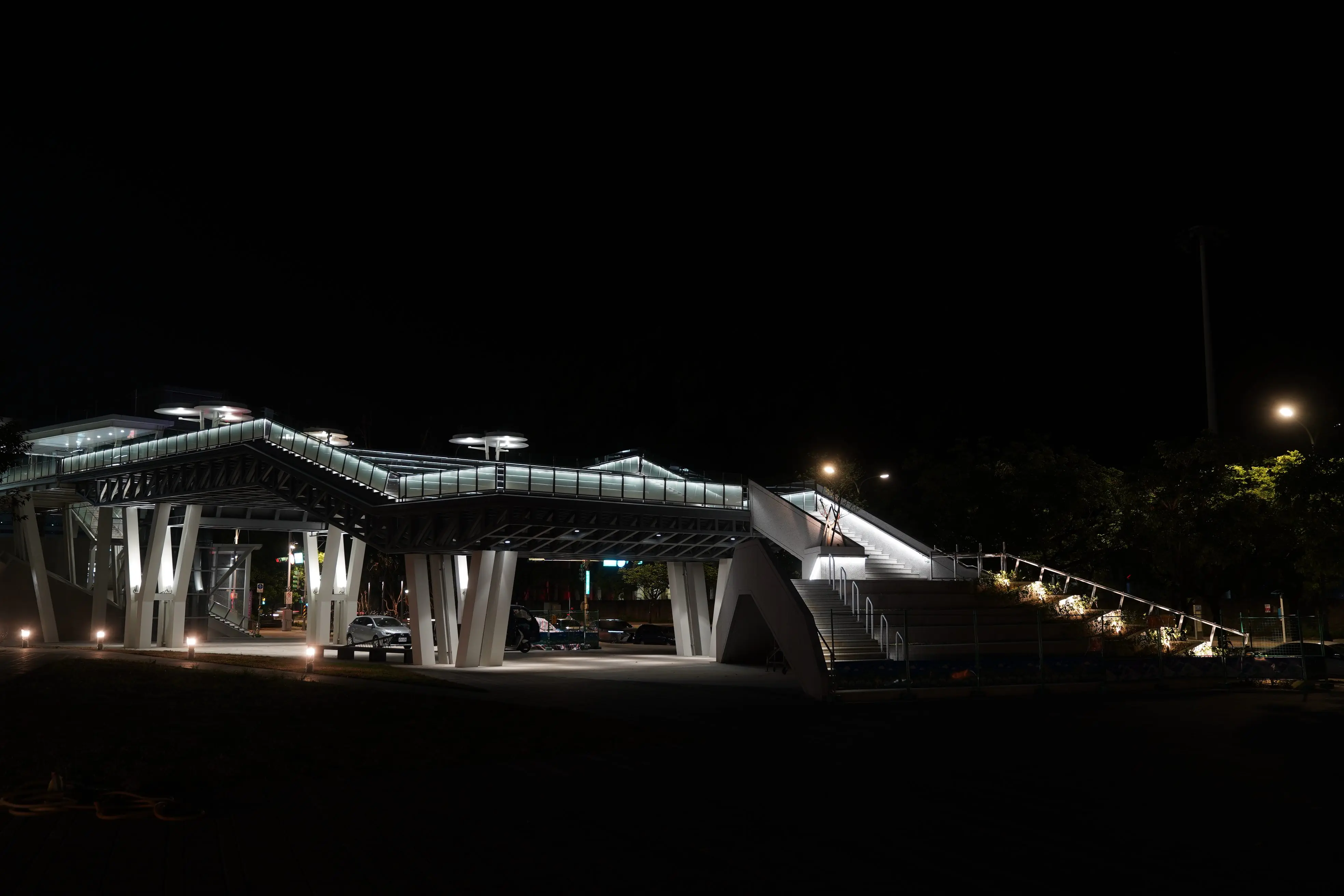 陳百慶科長說明,南港立體連通平臺工程還提供安全且兼具美學的步行空間;在夜間照明部分,兼具功能性與視覺美感,以光線引導民眾通行,提升夜間環境的安全感,以「人本步行」與「東區綠廊串聯」為核心理念,在橋體內部、階梯與平臺等處採用嵌入式或隱藏式燈具,並在欄杆與邊緣運用間接打光技術,有效控制眩光與光害,大幅提升使用者夜間通行的舒適度與安全性。南港立體連通平臺工程還提供安全且兼具美學的步行空間;在夜間照明部分,兼具功能性與視覺美感,以光線引導民眾通行,提升夜間環境的安全感