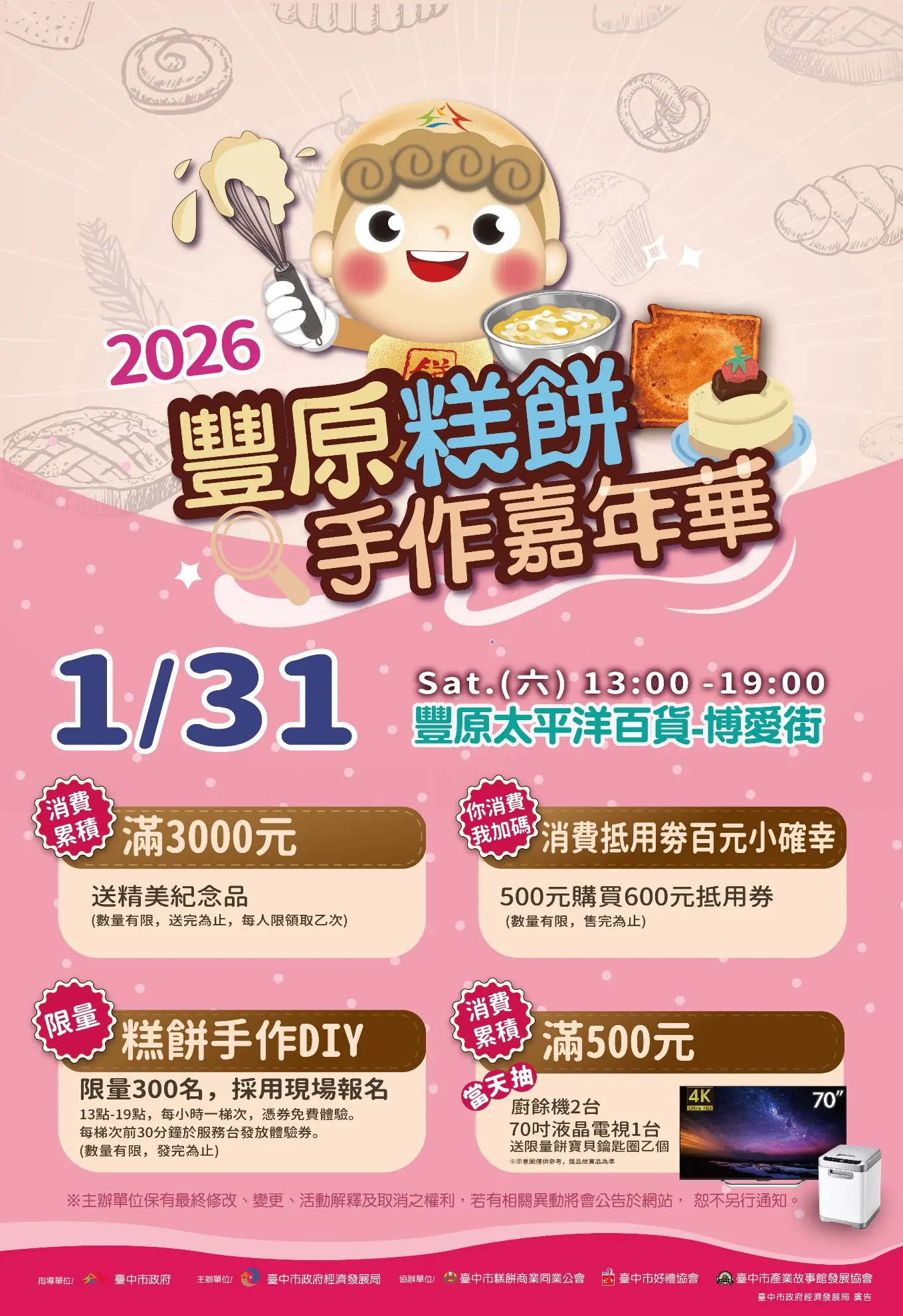 經發局說明,活動當日(1月31日)下午1時至晚上7時,現場規劃多項人氣活動,包括「500元就能買到600元消費券」、消費滿500元即可獲得限量鑰匙圈並參加摸彩,獎項包含廚餘機、液晶電視等實用好禮;消費累積滿3,000元,還可兌換限量活動紀念品。最受期待的糕餅手作DIY體驗,限量300名,分6梯次進行、每梯次50人,將於各梯次體驗前30分鐘在服務台發放號碼牌,每人限領1張,發完為止,邀請民眾親手從揉製、成形到烘烤,完整感受糕餅職人的製作樂趣。
