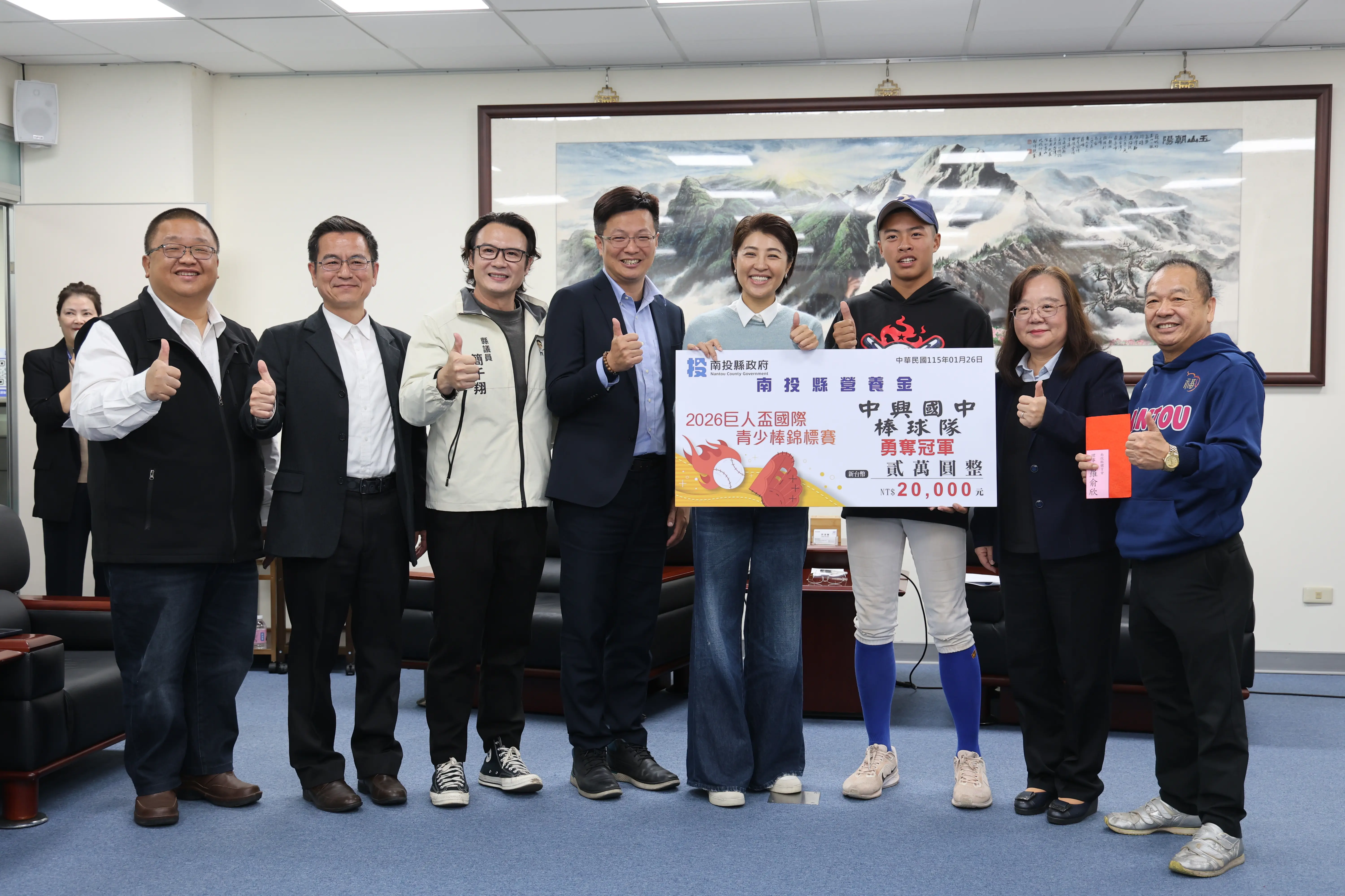 南投縣基層棒球運動再傳捷報!南投縣立中興國中棒球隊於「2026年巨人盃國際青少棒錦標賽」中,在多達48支國內外勁旅中脫穎而出,勇奪隊史首座巨人盃冠軍獎盃。縣長許淑華26日上午10時於縣長室接見全體隊職員,頒發獎狀及營養金,表彰選手與教練團的辛勞與榮耀,並期許小將們持續前進,再創高峰。