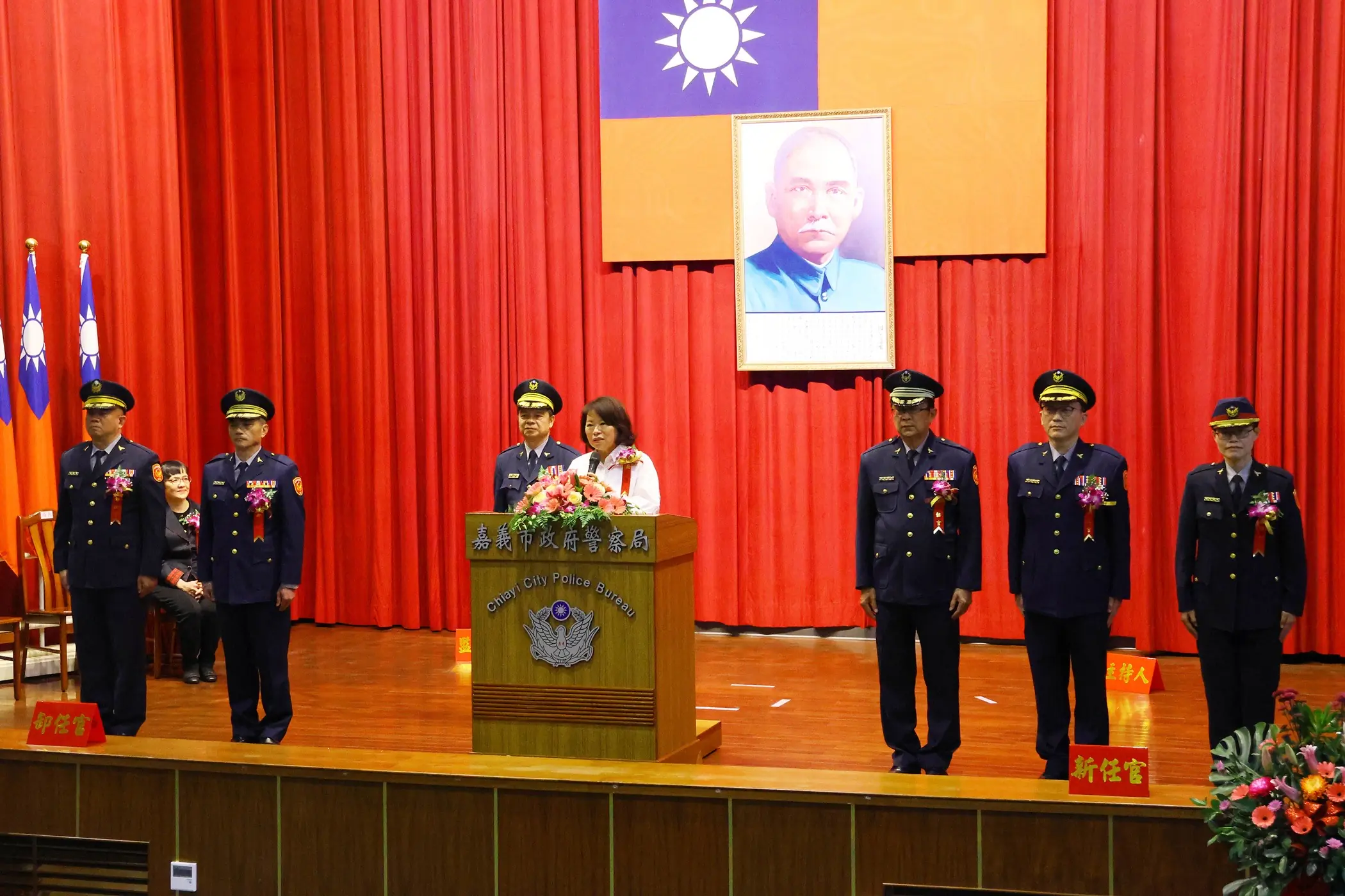 嘉義市政府警察局於今(26)日下午於黃敏惠市長主持見證下,舉行卸、新任分局長聯合交接典禮,邀集各級民意代表、各界貴賓與會觀禮;現場由第一分局及第二分局副分局長代表卸任分局長,分別交接印信給新任分局長閻百川及林思妙,並介紹新任主任秘書吳正文。