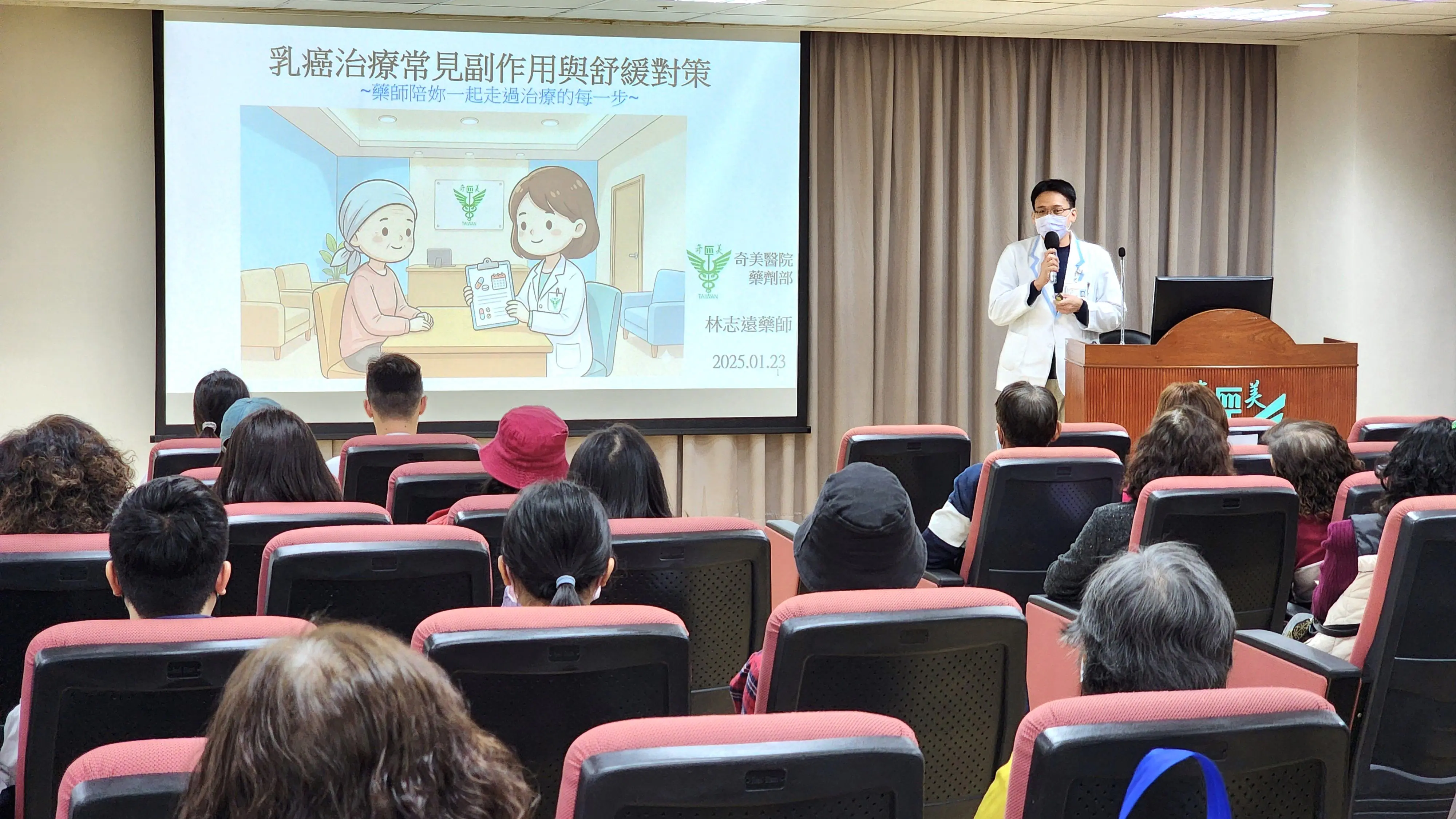 乳癌治療過程中,化療與標靶藥物常帶來副作用,如噁心、掉髮、疲倦、免疫力下降等。奇美醫院藥劑部藥師林志遠分享「乳癌治療常見副作用與舒緩對策」,病友可透過「飲食調整、規律作息、適度運動」及「藥物輔助」來減輕不適,並提醒病友主動與醫療團隊溝通,避免自行停藥或使用偏方,確保治療安全與效果。
