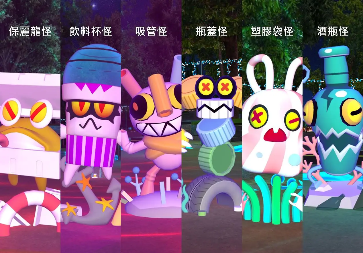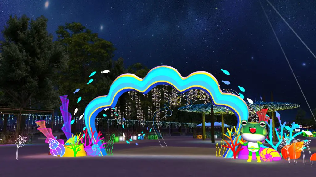 從「海洋之心」進入「永續海洋燈區」,穿越「蚵棚之境」,沉浸在「海底隧道」中,加入「英雄戰將」的行列對抗「海廢怪」,「環海戰艦」宣示共同守護海洋的決心,「等鱟站」期待未來在嘉義的海灘,能與野生小鱟們來一場浪漫邂逅。