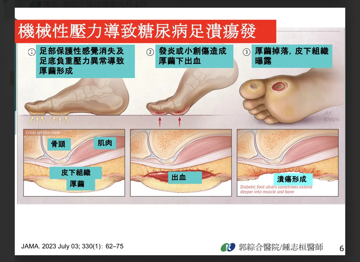 鍾志桓說,糖尿病足感染導因於癒合不良之潰瘍傷口發生感染,因長期高血糖導致周邊神經病變而造成足部保護性感覺缺失,受傷之後渾然不知而漸漸形成潰瘍性傷口;其次周邊動脈疾病造成潰瘍部位血流不足,組織缺氧及養分供應降低阻礙傷口癒合。
