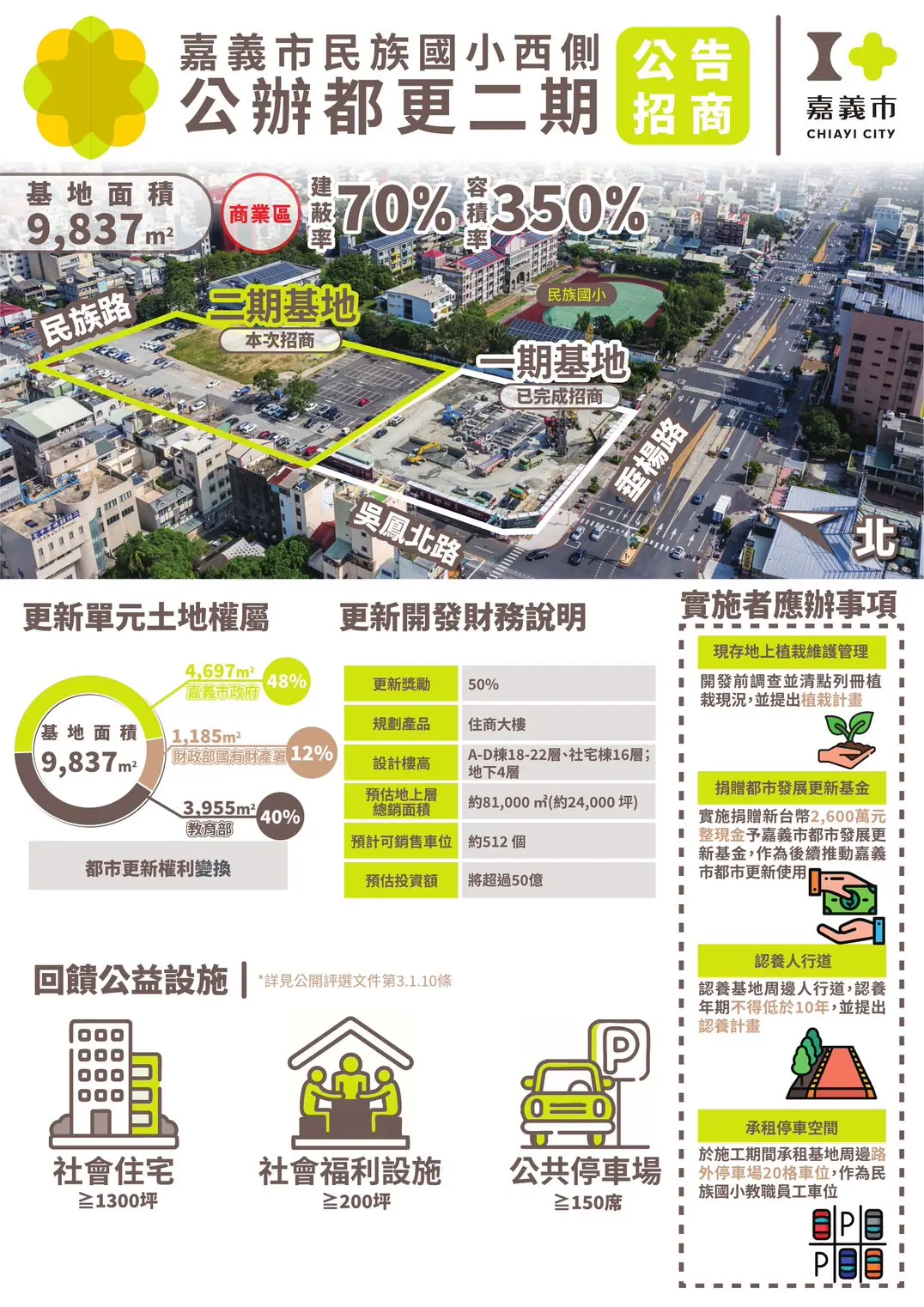 「民族國小西側二期公辦都市更新招商案」是活化市中心公有土地、促進都市再發展的重要里程碑,亦是吸引國內優質投資力量參與地方建設與長期經營合作的良機。本案招商公告期間至115年4月28日截止,歡迎各界踴躍參與投標,相關公告招商訊息,請至嘉義市政府全球資訊網首頁/電子公告欄(https://www.chiayi.gov.tw/News.aspx?n=464&sms=9155),或至嘉義市政府都市發展處網站(urban.chiayi.gov.tw)/訊息專欄/都市更新科參閱。