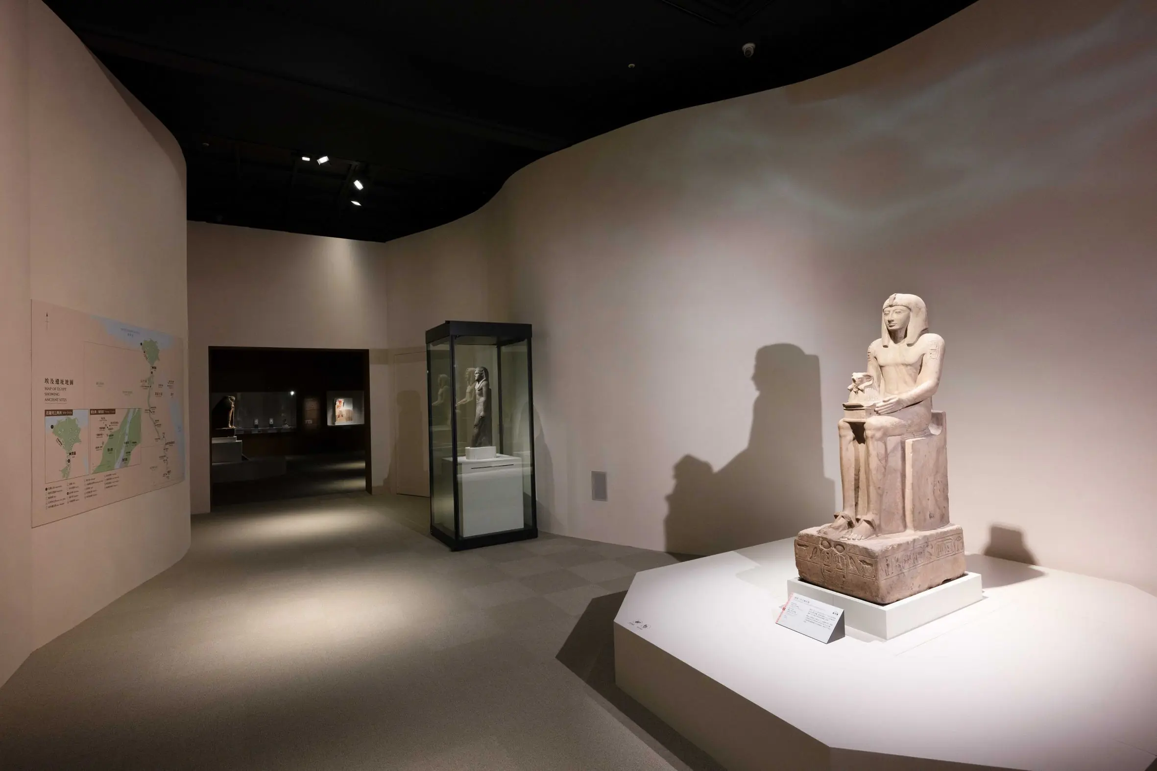 展場空間劃分成七大面向,運用色彩光影、建築語彙與現代配樂,強化觀眾對古埃及法老王權世界的理解。穿越入口廊道、踏進單元一「埃及:法老的國度」馬上就會被潺潺流水聲環抱;塞提二世王權坐像靜靜坐在有如尼羅河蜿蜒曲線的牆面前,搭配水波紋光影,觀眾彷彿行走在埃及的生命之河上,見證法老統治3000年的輝煌歷史。