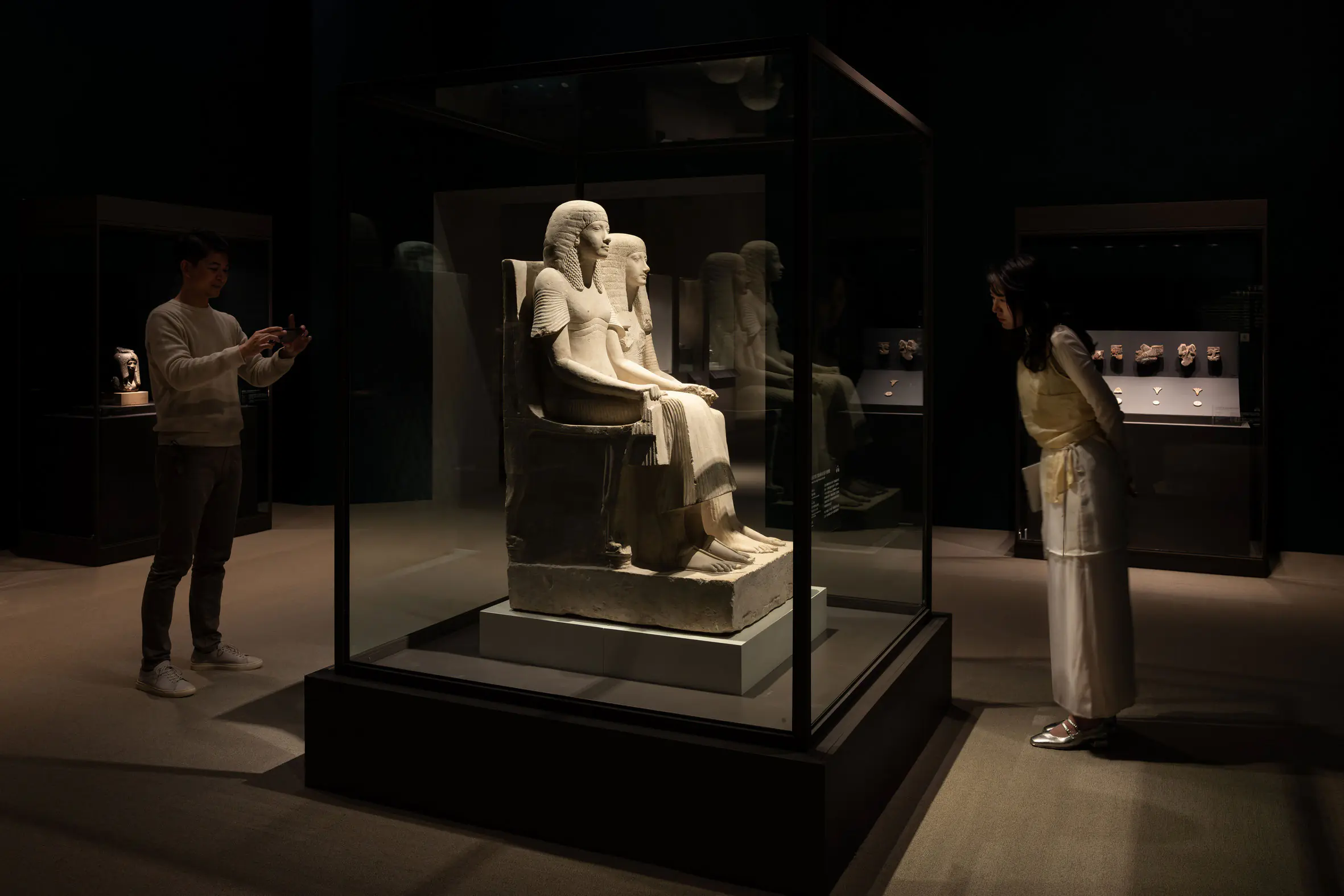 ▲第四單元「王室」,圖中為展品〈未來的國王霍朗赫布及妻子的雕像〉。圖:奇美博物館提供。
