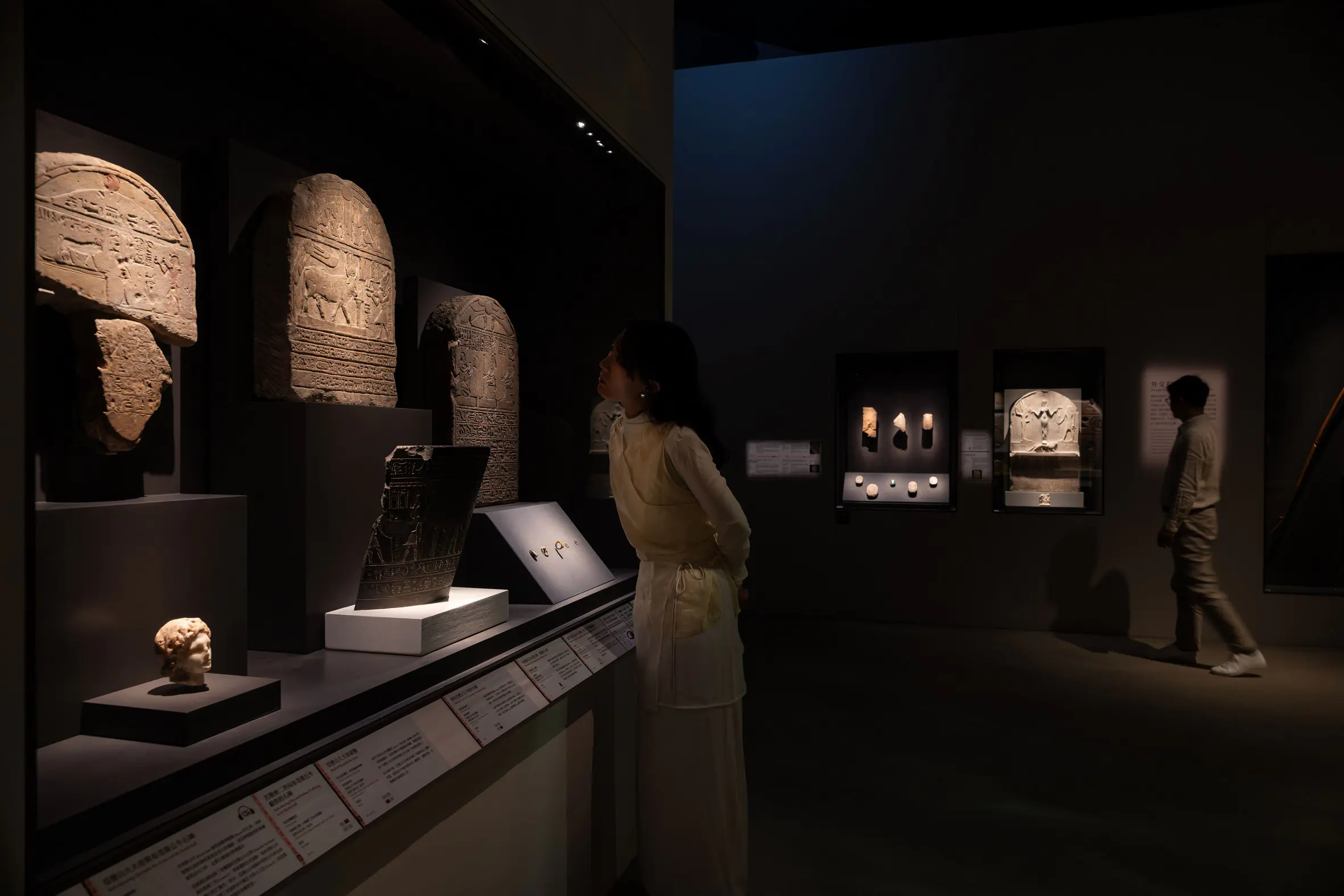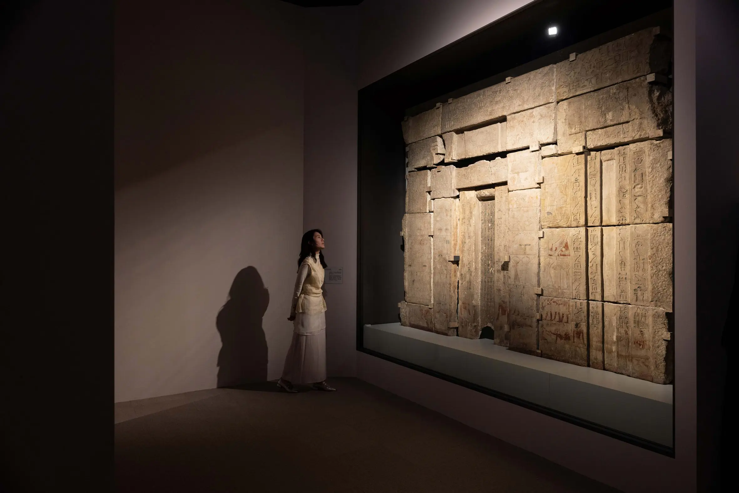 隨後,展間轉為碧綠色調,開啟單元四「王室」篇章。綠色在古埃及象徵重生與繁榮,觀眾可在此近距離凝視王室成員的面容,並一窺宮殿居所的壁磚裝飾。單元五「統治埃及」與單元六「埃及與世界」展場空間延續河流意象,但改以有稜有角的曲折動線羅列文物,隱喻政權的衝突與磨合,看見法老如何在軍事對峙與外交運籌中,將古埃及推向古代世界貿易網絡的核心樞紐。