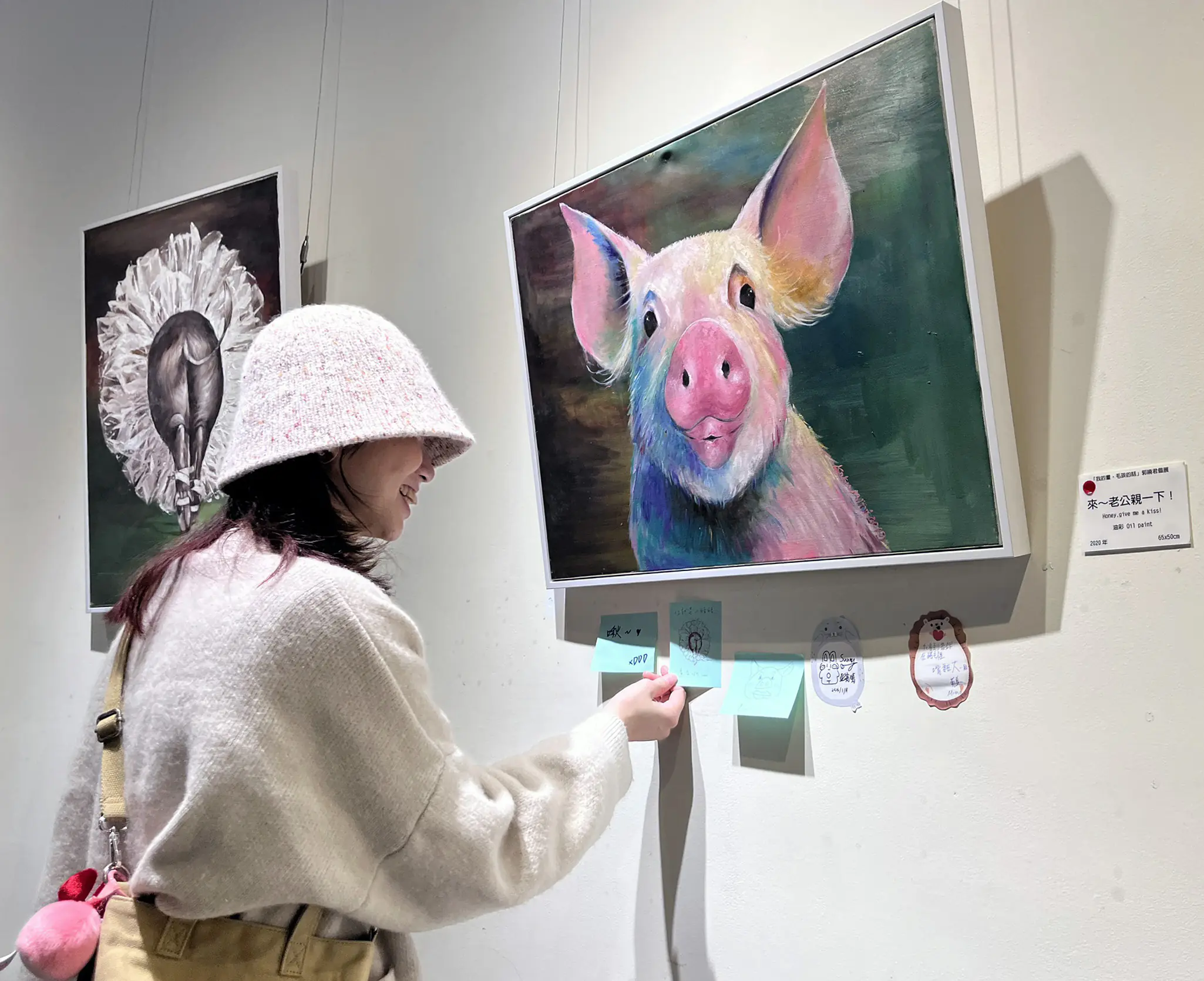 其中,港區藝術中心指出,郭曉君展出作品《來~老公親一下!》以溫暖幽默的視角描繪毛孩討喜的瞬間,成功吸引觀者目光。畫面中神情無辜、色彩柔和的小豬直視觀眾,微微張開的嘴與圓潤鼻頭彷彿正撒嬌般靠近,誇張又可愛的表情令人會心一笑,洋溢著親暱與幸福氛圍。