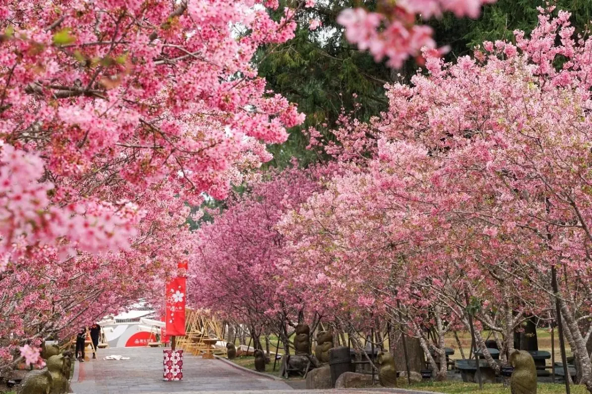 這場粉紅盛會將由園內共六大品種、超過六千株的櫻花交織而成,共同完成一場春櫻接力賽。從一月下旬起,姿態優雅的枝垂櫻率先綻放;邁入二月上、中旬,色澤紅豔討喜的八重櫻接棒染紅山林,將祭典氛圍推向第一波高峰;而二月中、下旬,吉野櫻、富士櫻、山櫻以及潔白如雪的「台灣雪櫻」也將相繼入陣。預估二月中旬起,園區將正式進入最佳賞花時段,讓遊客不論何時造訪,都能邂逅櫻花綻放的不同絕美丰采。