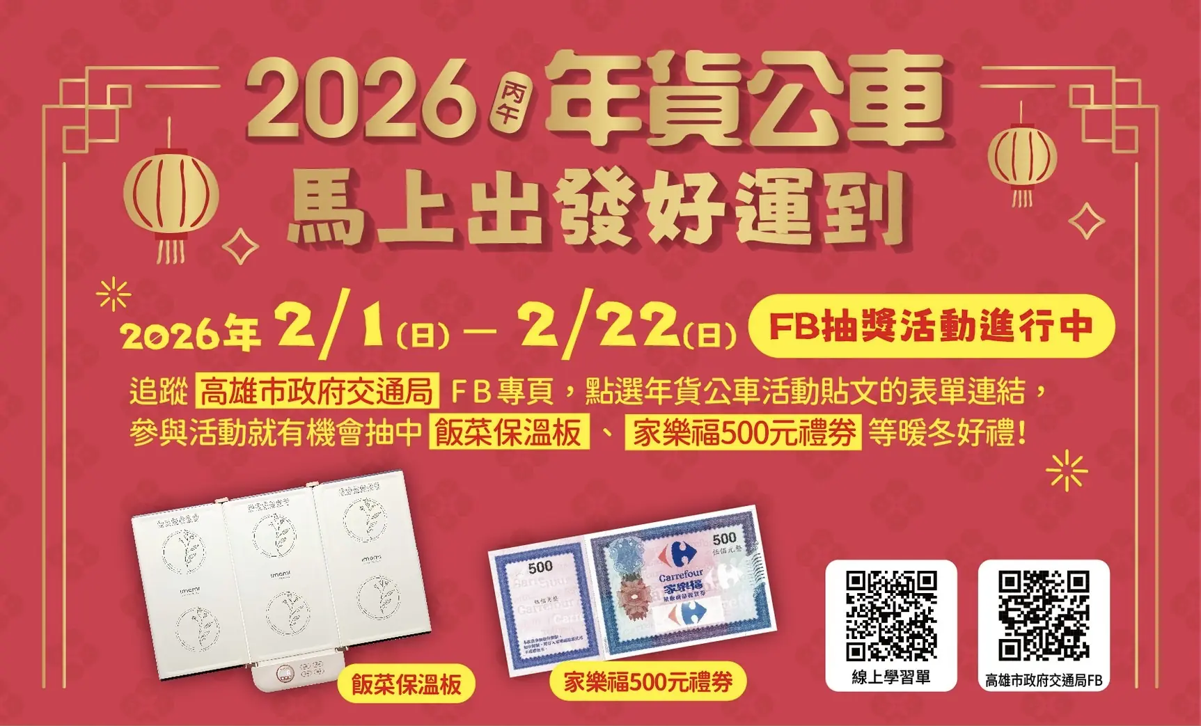 年節採買就從搭公車開始!馬年新春好運一路到,為鼓勵市民使用TPASS搭公車至三鳳中街辦年貨,高市府交通局推出「馬上出發好運到」-2026年貨公車抽獎活動,2月1日起至2月22日,至「高雄市政府交通局」官方臉書活動貼文完成答題任務,就有機會抽中最高價值超過三千元的人氣飯菜保溫板等暖冬好禮。