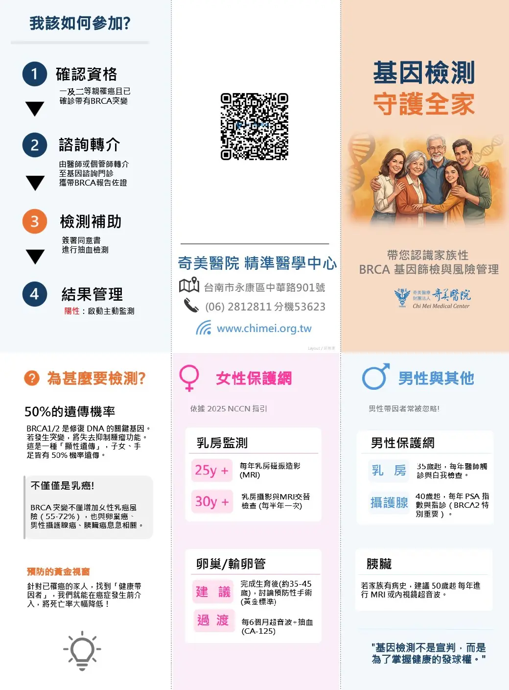 奇美醫院院長林宏榮表示,基因檢測不是宣判,而是為了「掌握健康的發球權」。奇美醫院積極響應政府「健康臺灣」的願景,在衛生福利部「健康臺灣深耕計畫」補助下,串聯區域醫療夥伴,攜手「高雄榮民總醫院臺南分院」、「營新醫院」、「洪外科醫院」、「仁村醫院」、「永和醫院」、「大安婦幼醫院」共九家醫療院所,一起建立「學習型照護聯盟」。透過精準醫學、系統化追蹤與全程管理,奇美醫院正一步步把癌症防治從「治療疾病」轉為「管理風險」,協助民眾在癌症敲門前就築好防線。