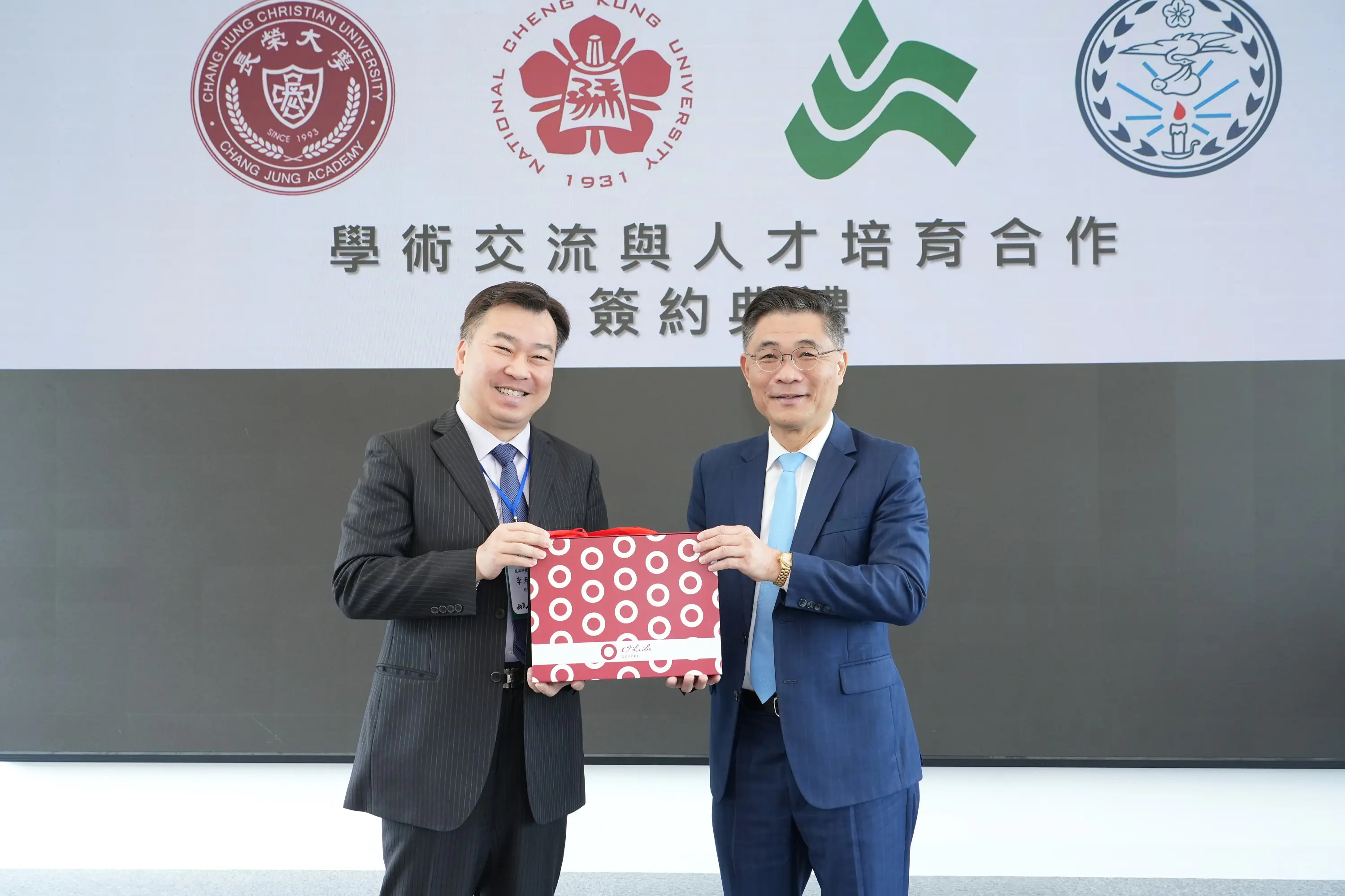 ▲崑山科大李天祥校長(左),成功大學沈孟儒校長(右)互贈禮品(成大新聞中心提供)